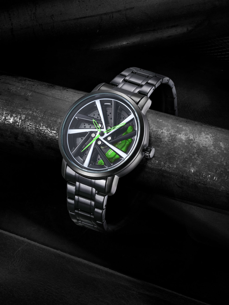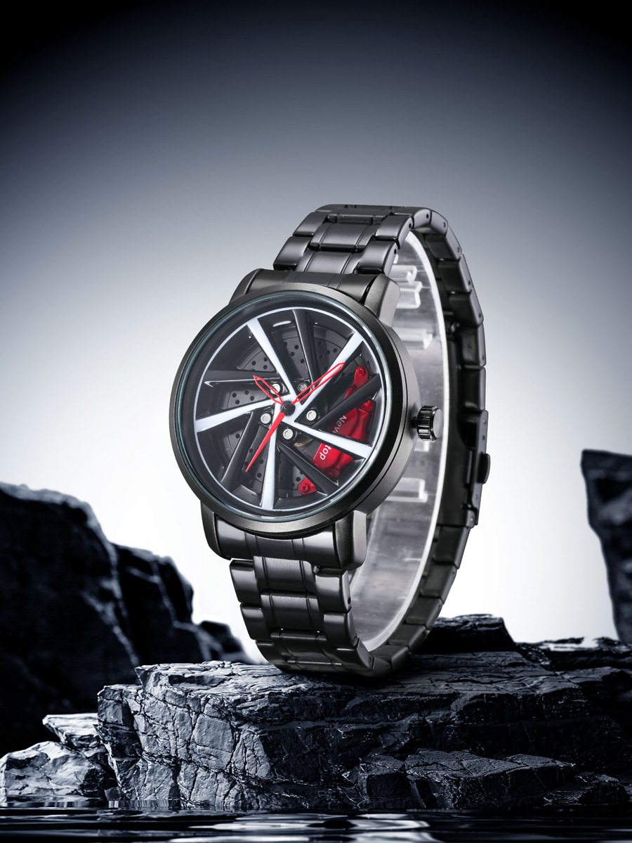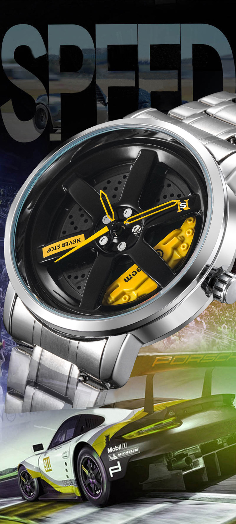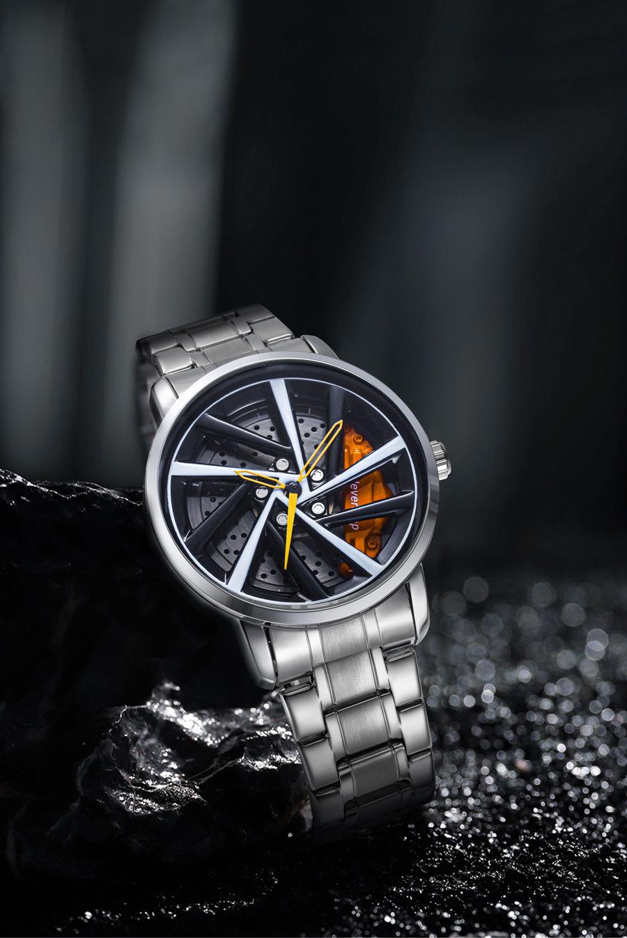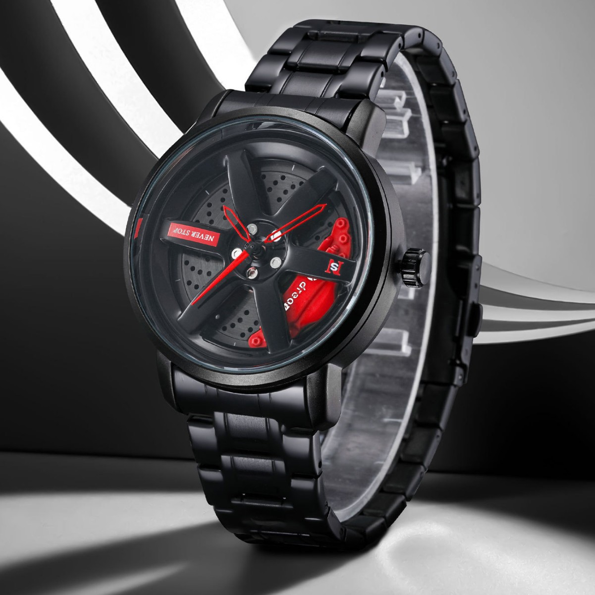 NS跨境热销汽车轮毂卡扣可转动表盘男钢带手表石英表工厂现货批发