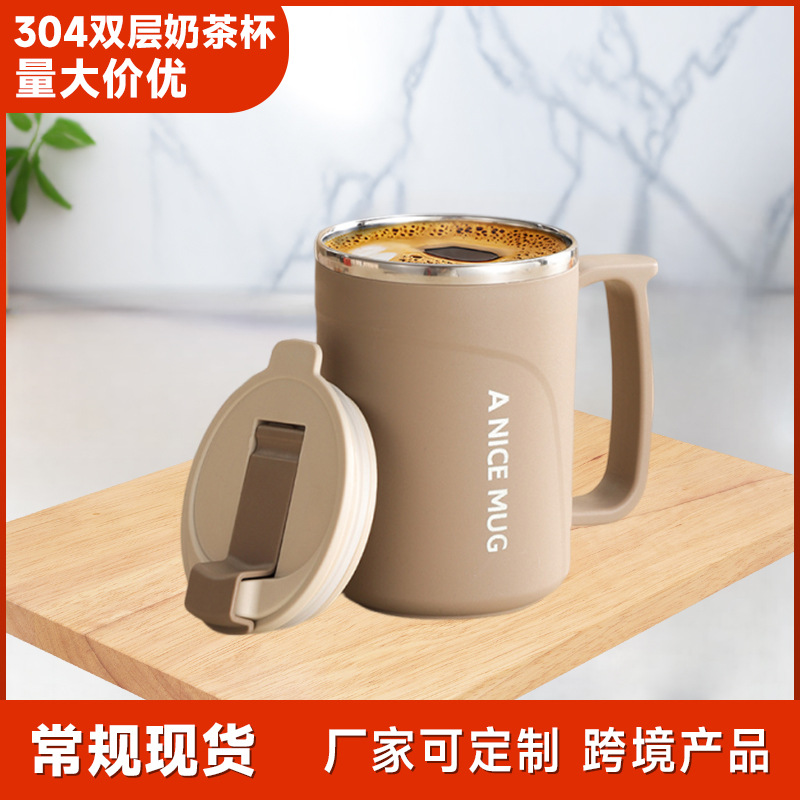二重構造ミルクティーカップ 450ml シリコンシール付き蓋付きマグカップ 304ステンレス鋼 家庭用 オフィス用 コーヒーカップ