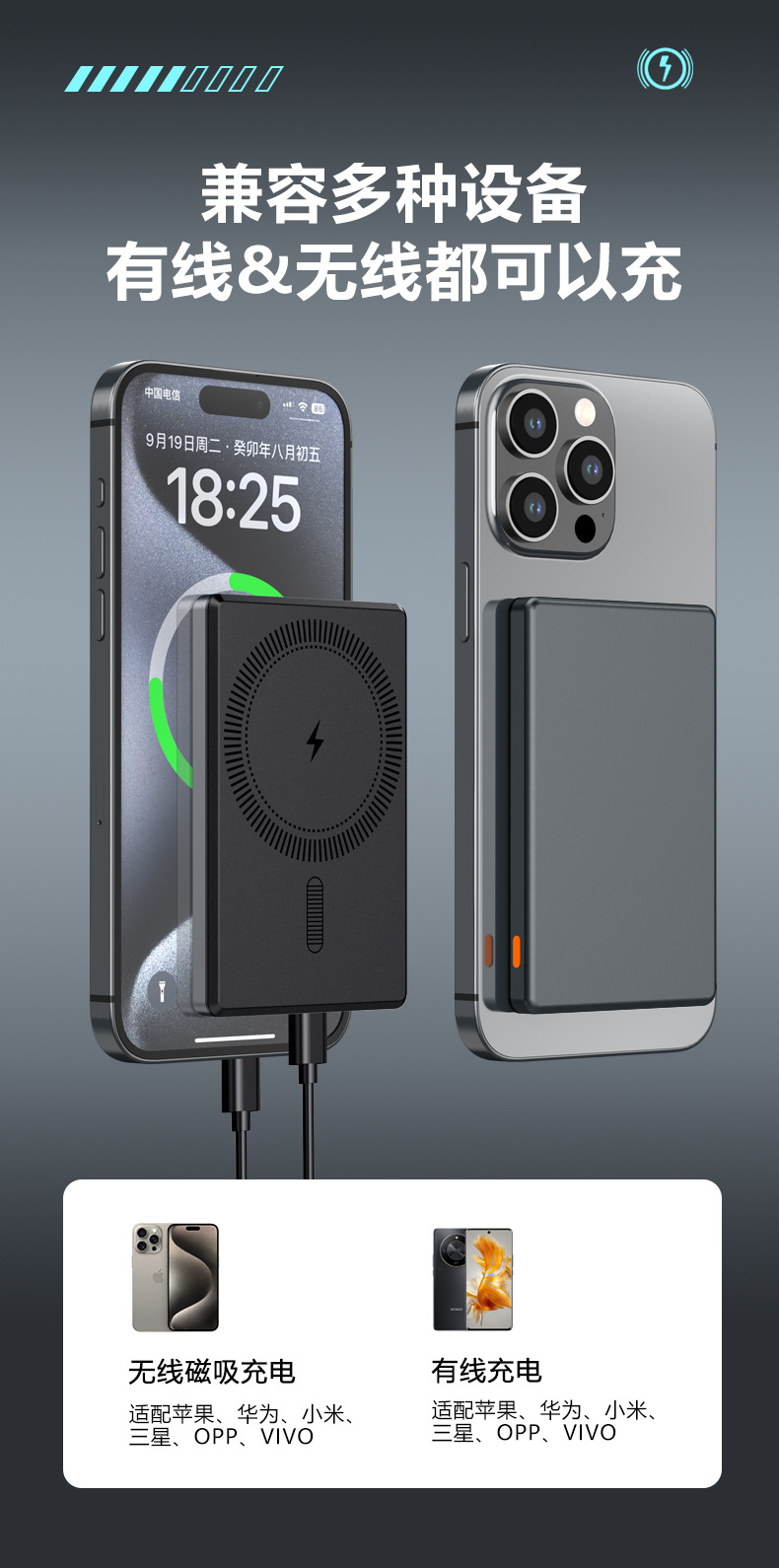 跨境新款超薄磁吸无线充电宝5000毫安金属数显无线快充移动电源