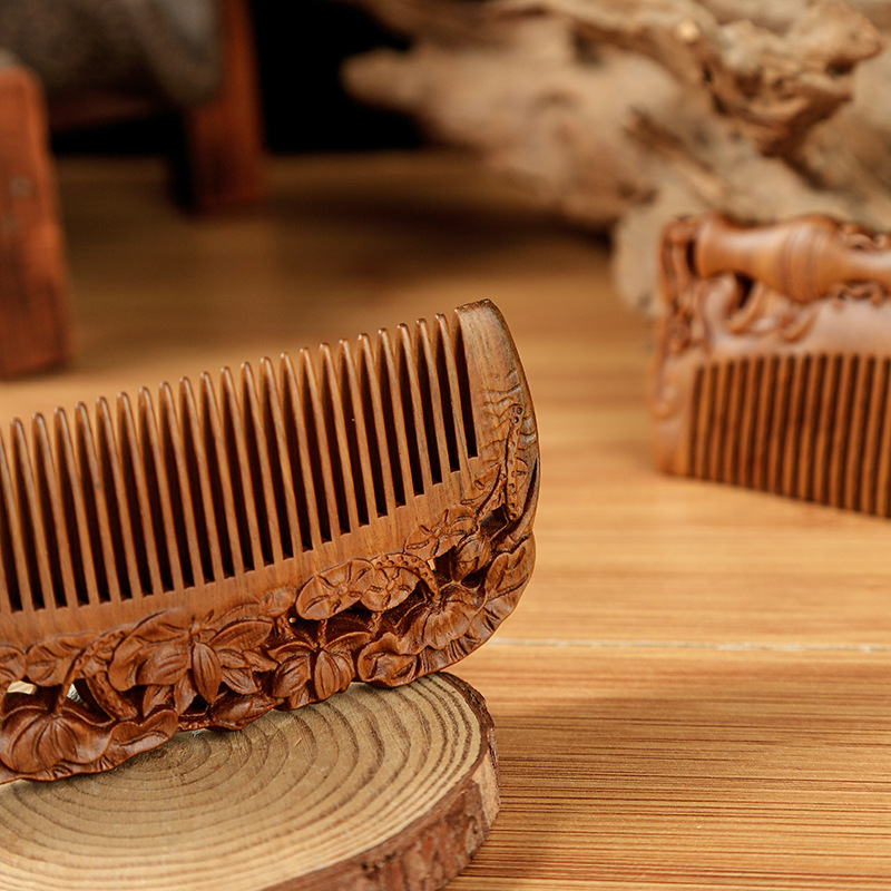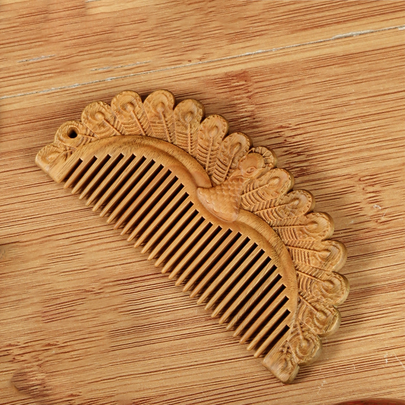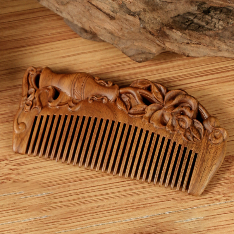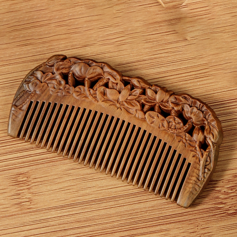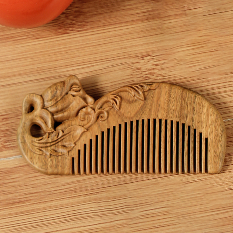 女性用携帯白檀櫛、クリエイティブな彫刻が施された木製櫛、細かい歯の白檀櫛