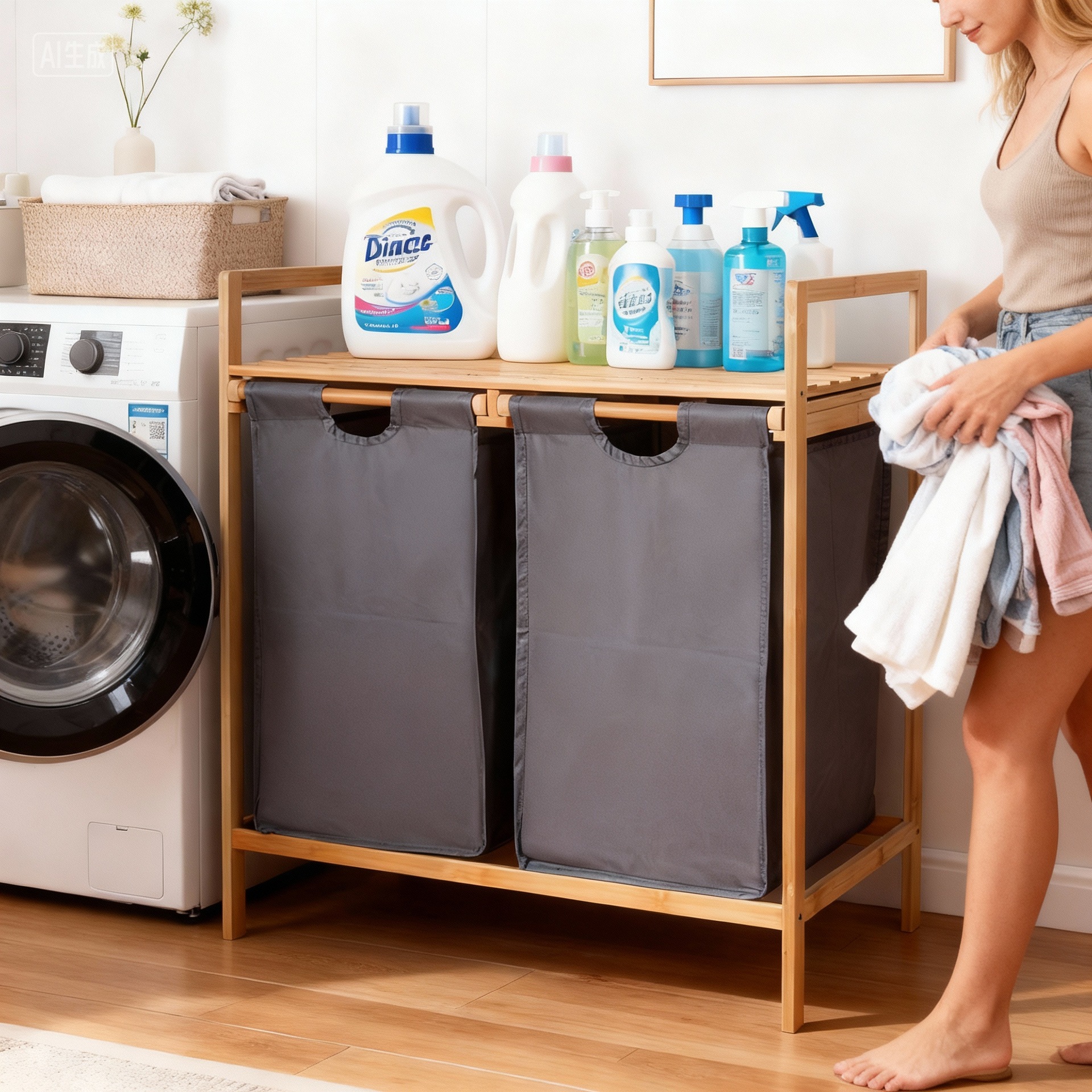 木质日式脏衣篮家用加布浴室衣物分类脏衣篓双桶抽拉式衣服收纳筐