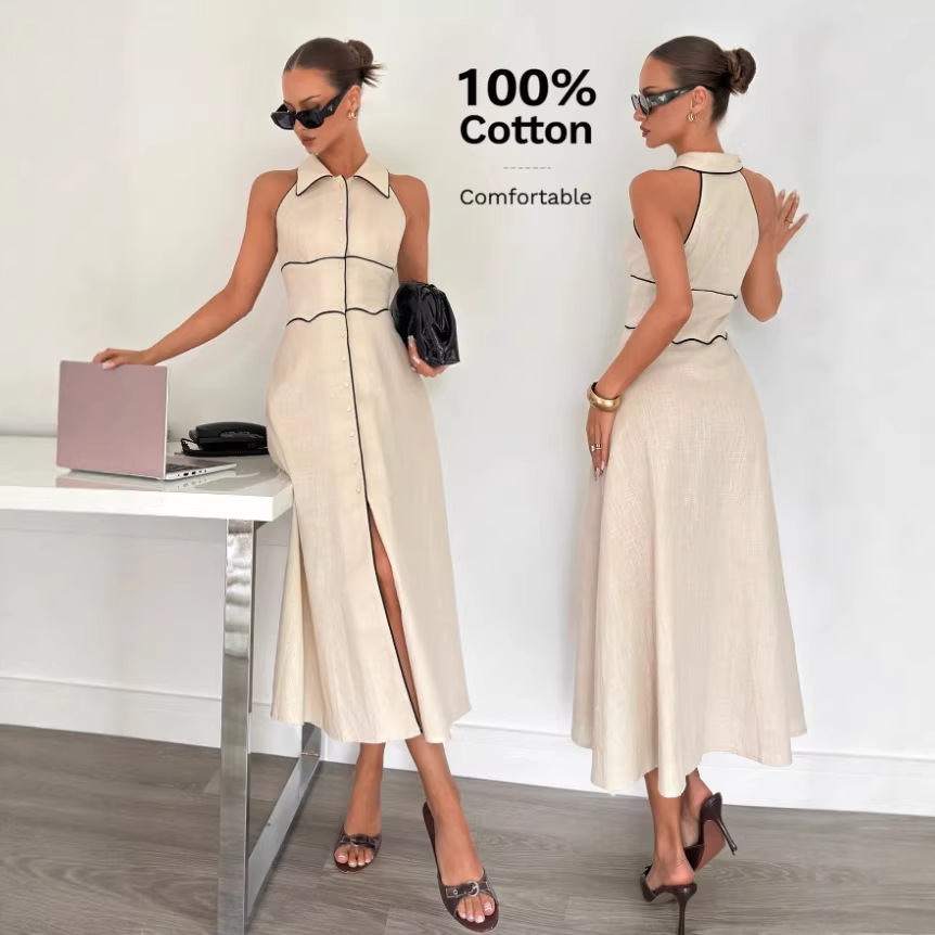 外贸跨境批发2026秋新品休闲女装无袖单排扣翻领高腰连衣裙