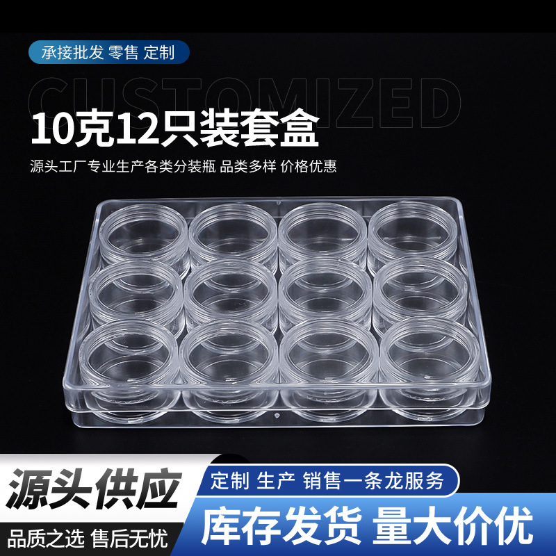 10グラム12本セットのプラスチック製の小さな丸い瓶のドラッグストアのクリーム瓶に瓶のファンデーション化粧品の箱を分けて入れます。