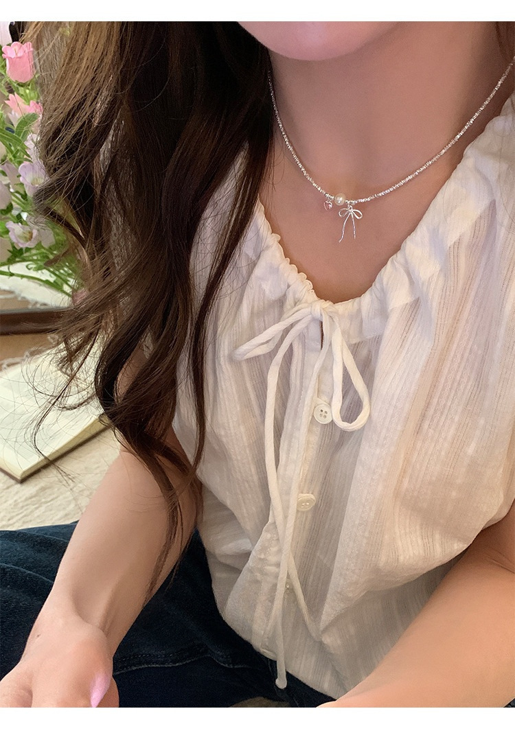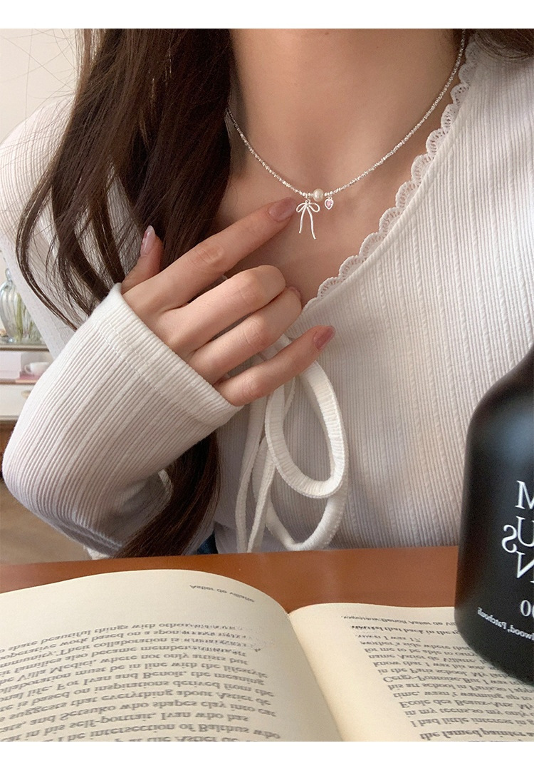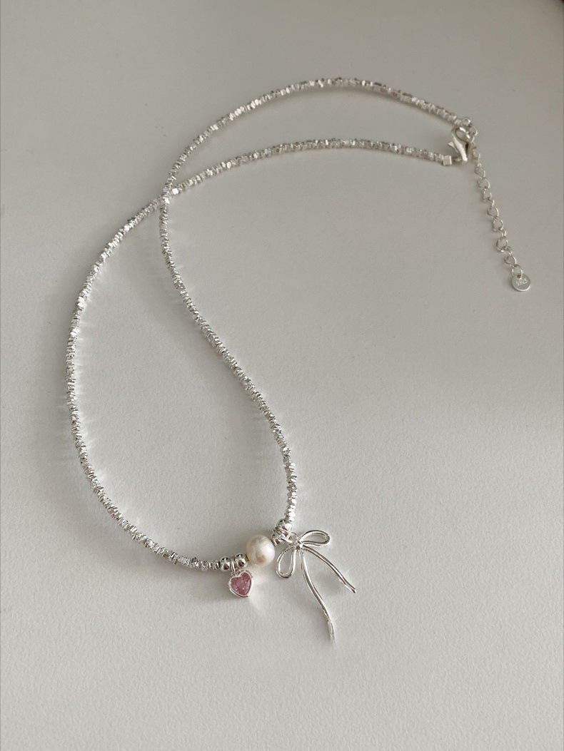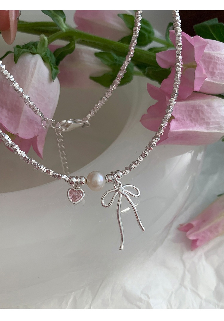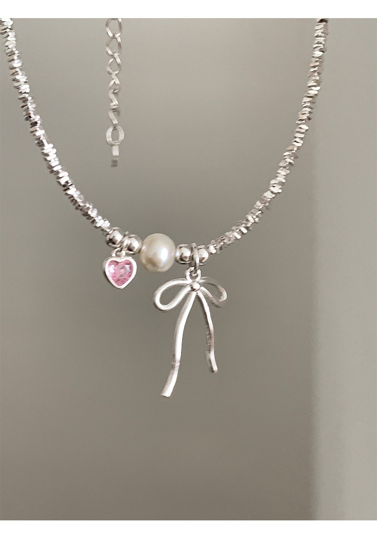 ピンクの甘いハートの銀の天然真珠のネックレスのバレエの風の蝶結びのピンクのドリルの愛の首の鎖の鎖の鎖の気質