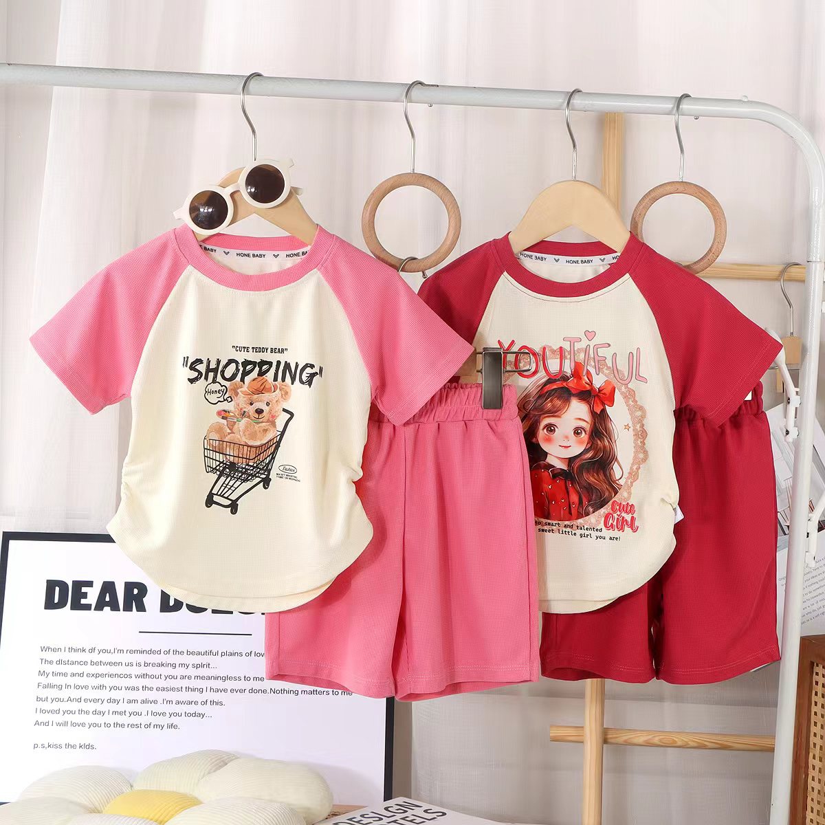 2025年 女の子 ワッフル素材 ラグラン半袖セット 多用途 漫画風 おしゃれ ガールズ 子供服 女の子 夏服 JK風
