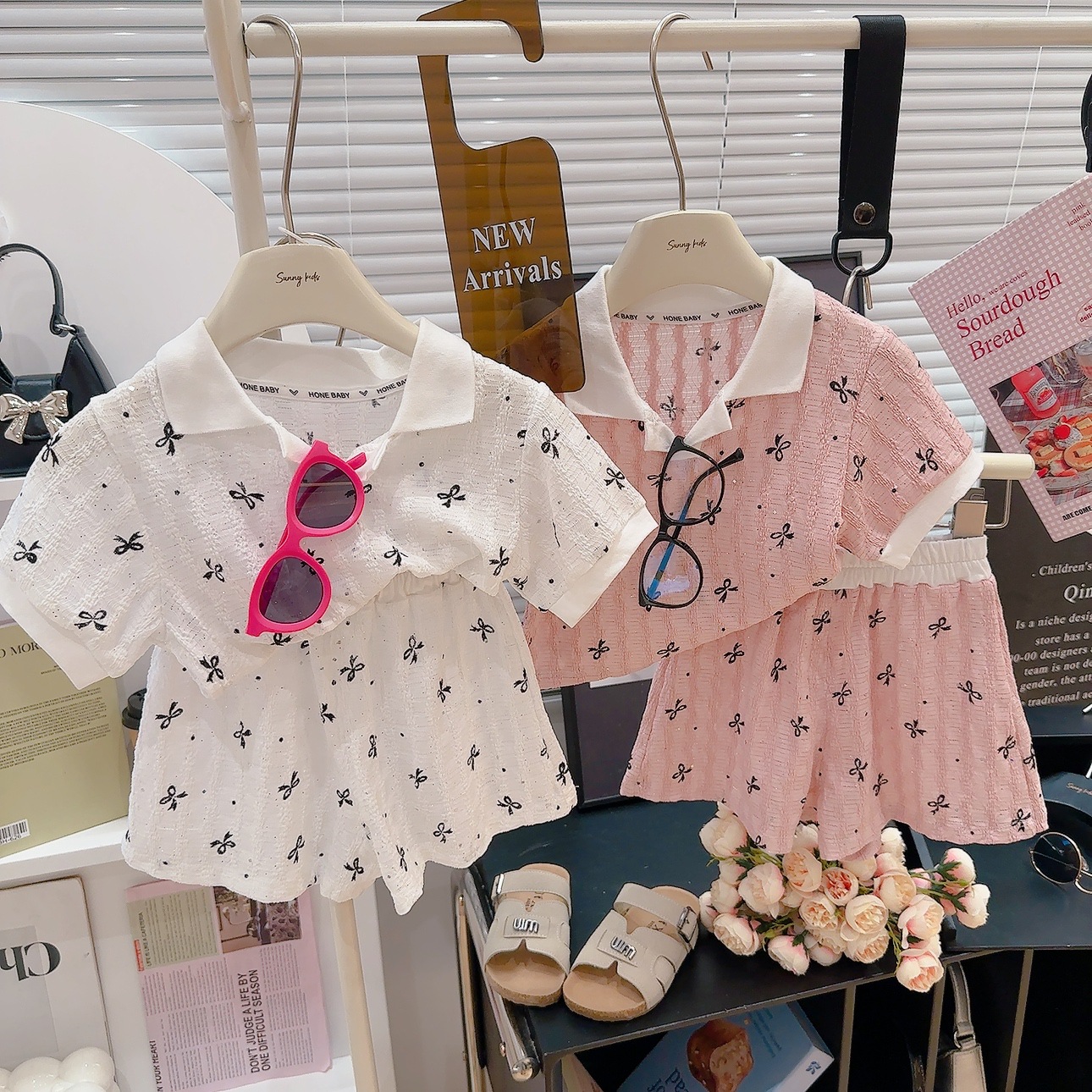 ポロ襟付き半袖ボトムシャツとショートパンツ、夏の新作、甘い女の子用ツーピースセット、ファッショナブルなラペル付き子供服