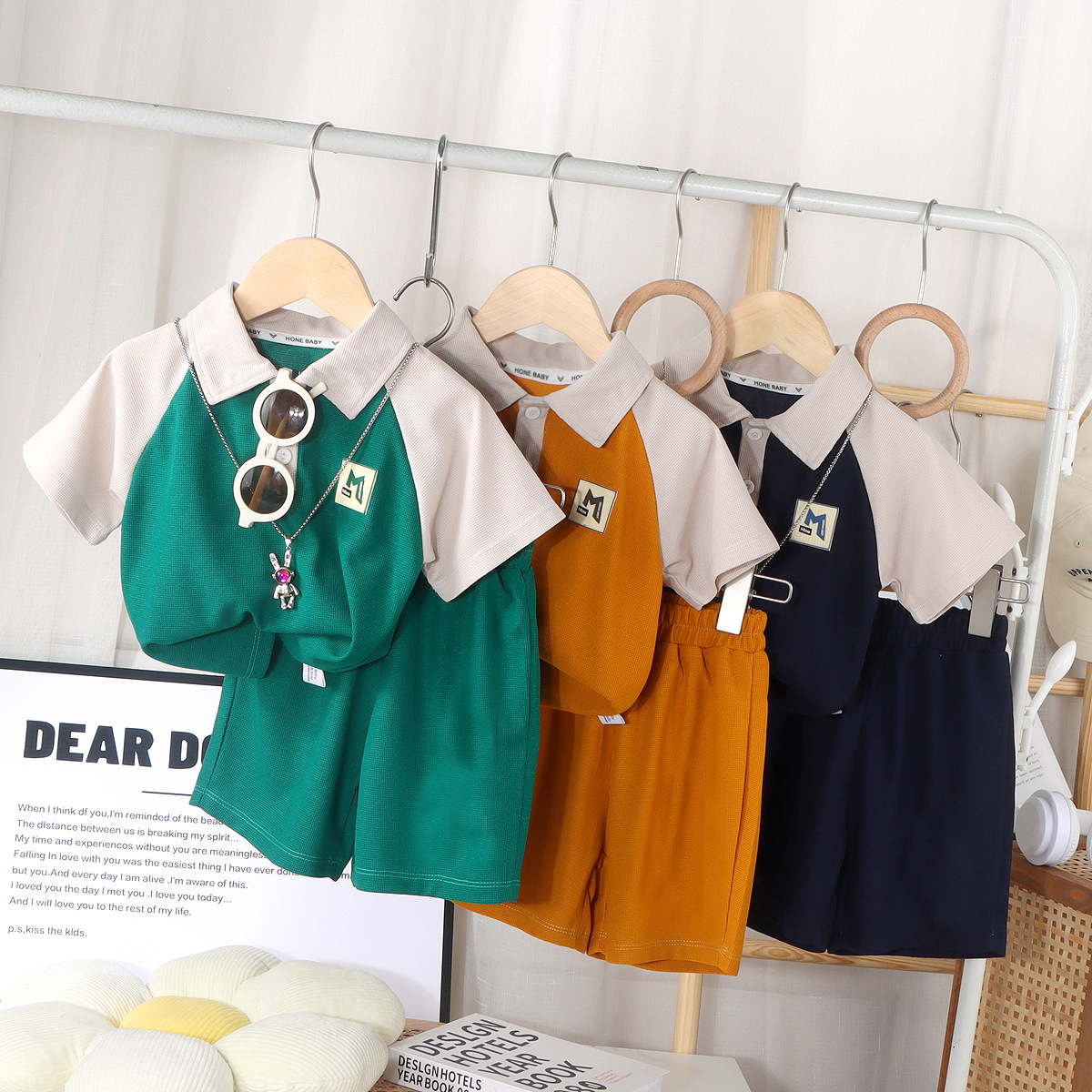 2025年子供用半袖ショートパンツセット、ポロ襟の切り替えデザイン、夏用男の子向けツーピースセット、通気性があり快適