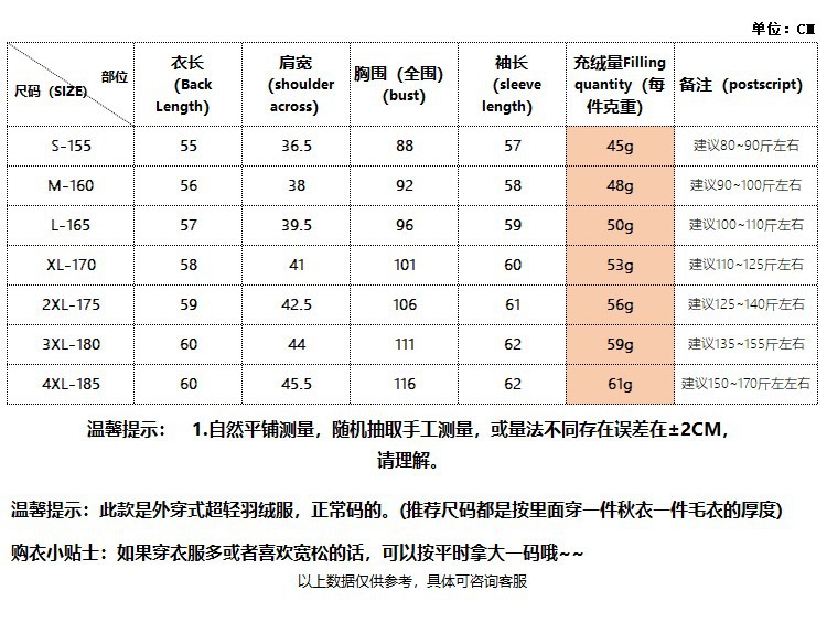 S码45克,M码48克,L码50克,XL码53克,2XL码56克,3XL码59克,4XL码61克