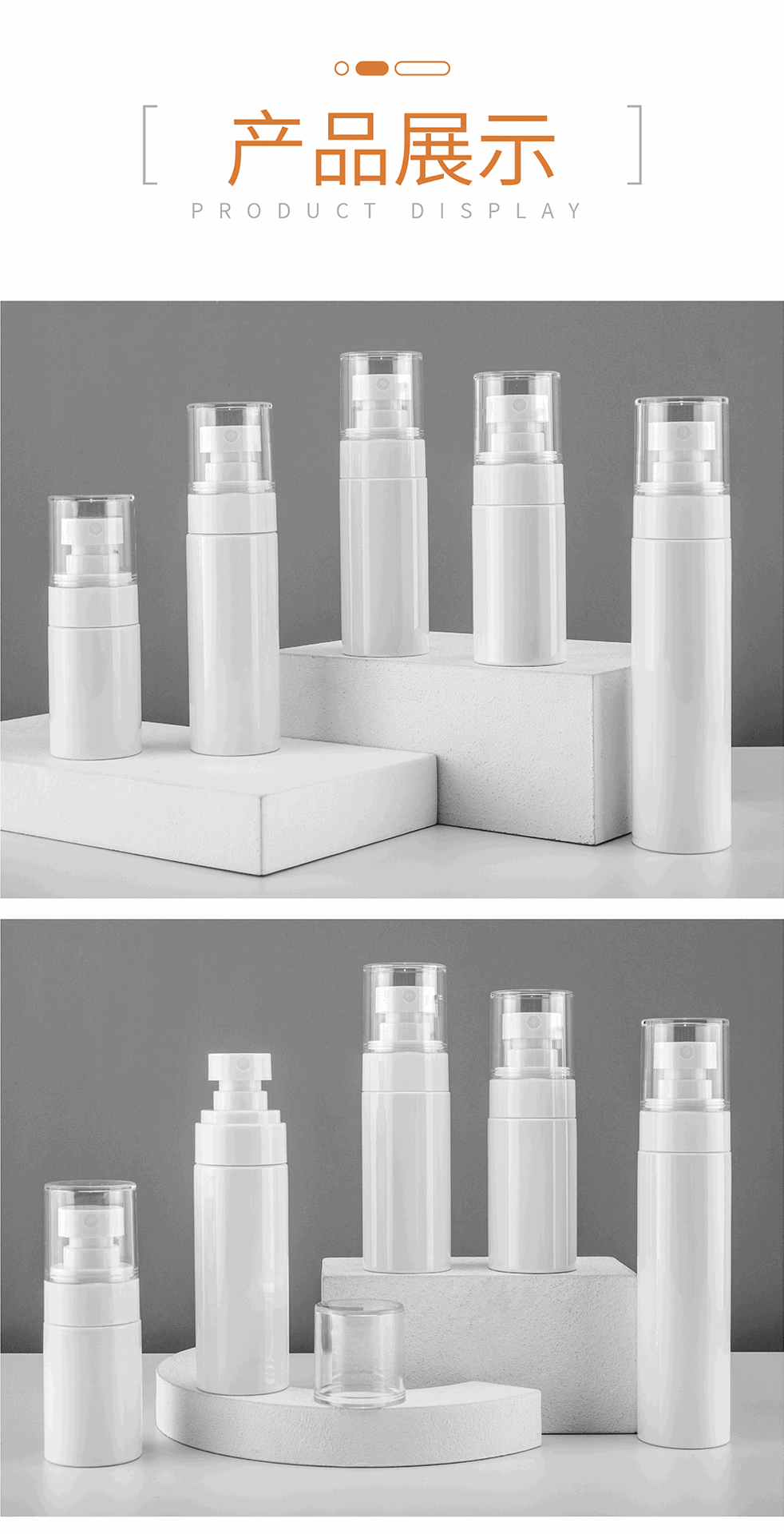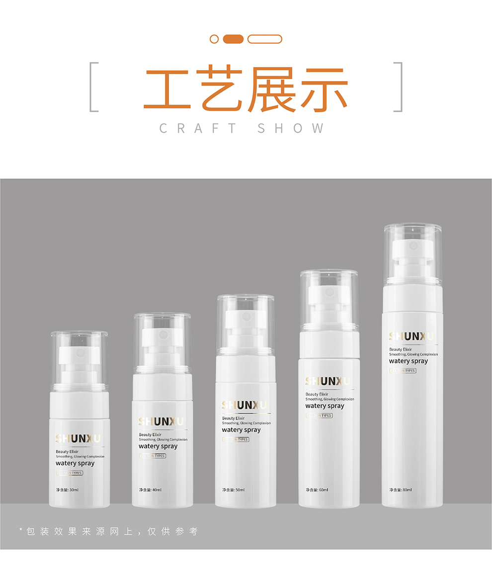 30ml、50mlのファインミストスプレーボトル、100mlのメイクアップセッティングスプレーボトル、120mlのスプレーボトル、80mlのプレスローションボトル在庫あり