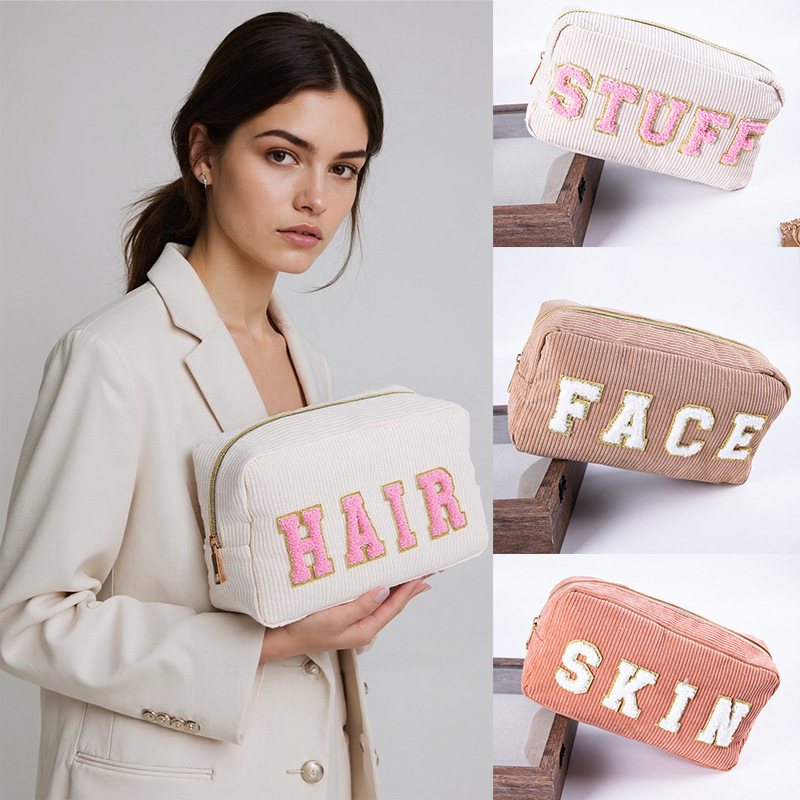 アルファベット柄コーデュロイタオル刺繍化粧ポーチ 中サイズ 雑貨収納ポーチ ジッパー付き 携帯用化粧品旅行収納