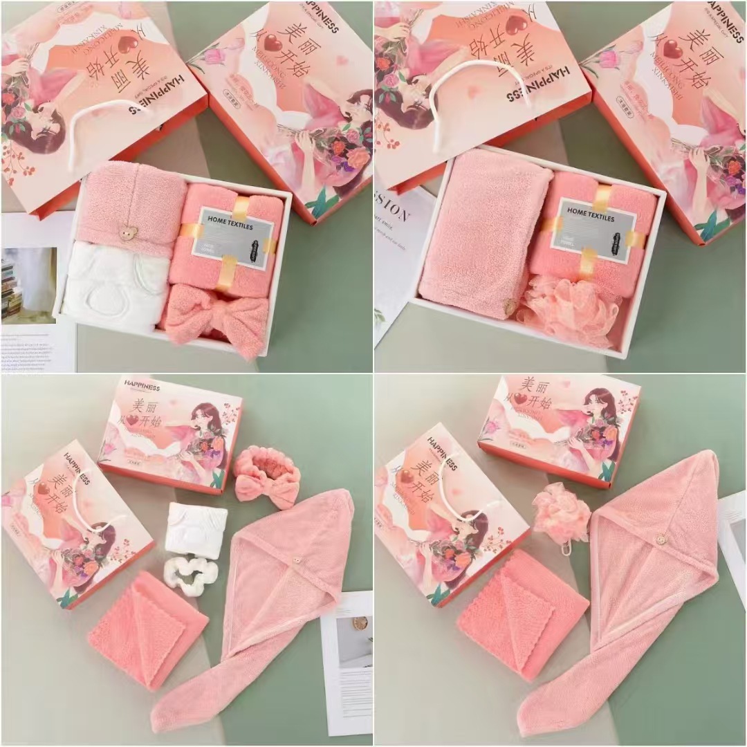 珊瑚の絨毯の美しい入浴タオルの乾いた髪の帽子のお風呂の花の3つのセットのギフトボックスの会社の従業員の福利のお土産の女性