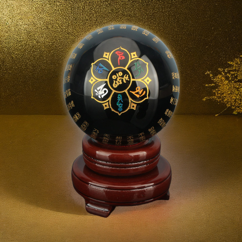 水晶玉飾り 黒曜石玉 彩色六字真言 心経 大慈悲真言 玄関飾り 富を呼び込む福球