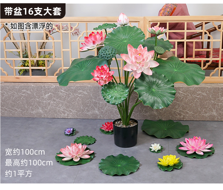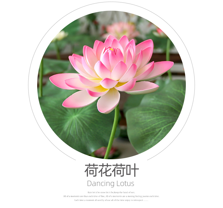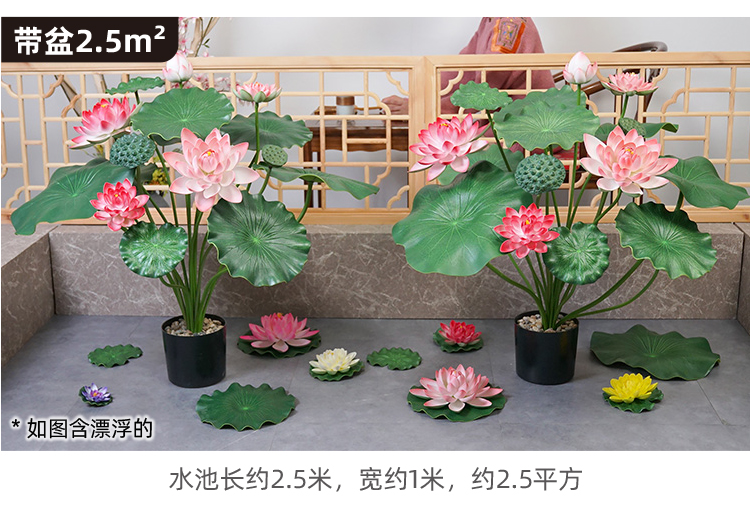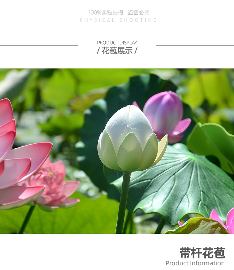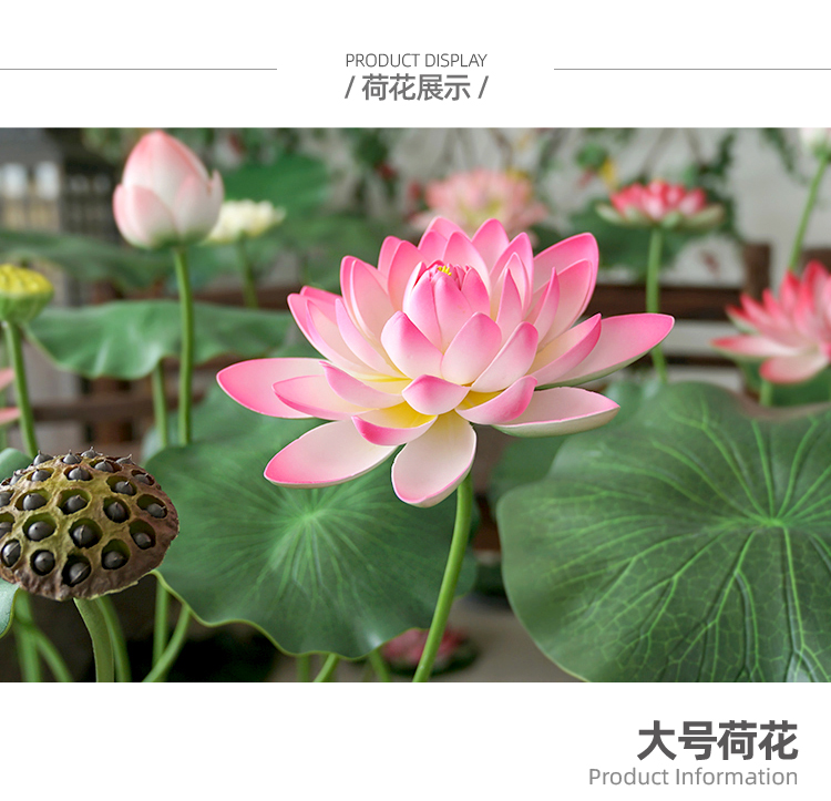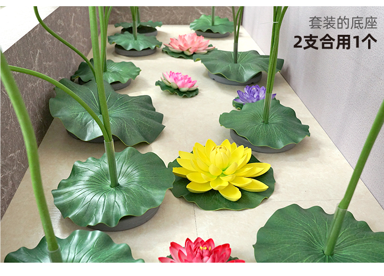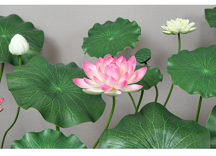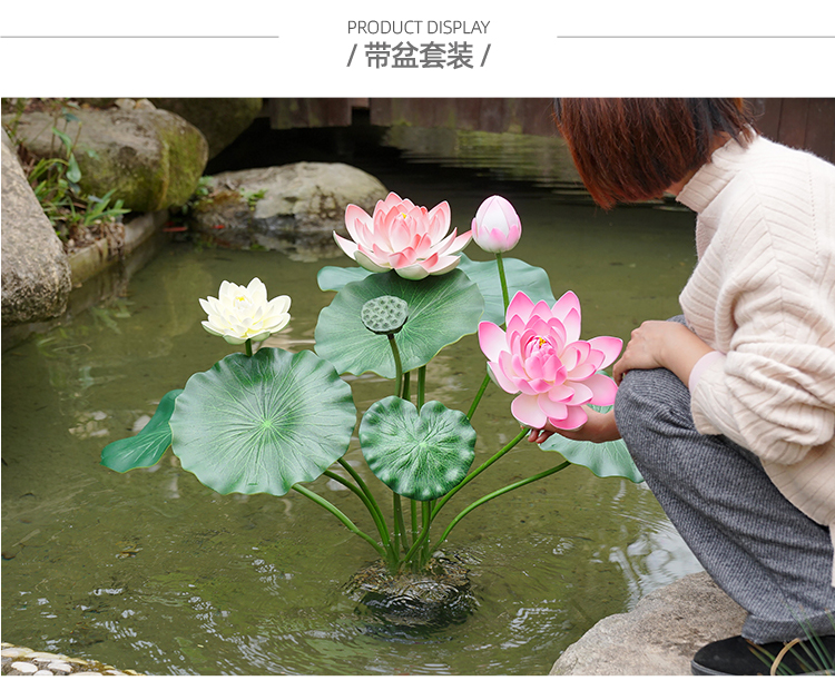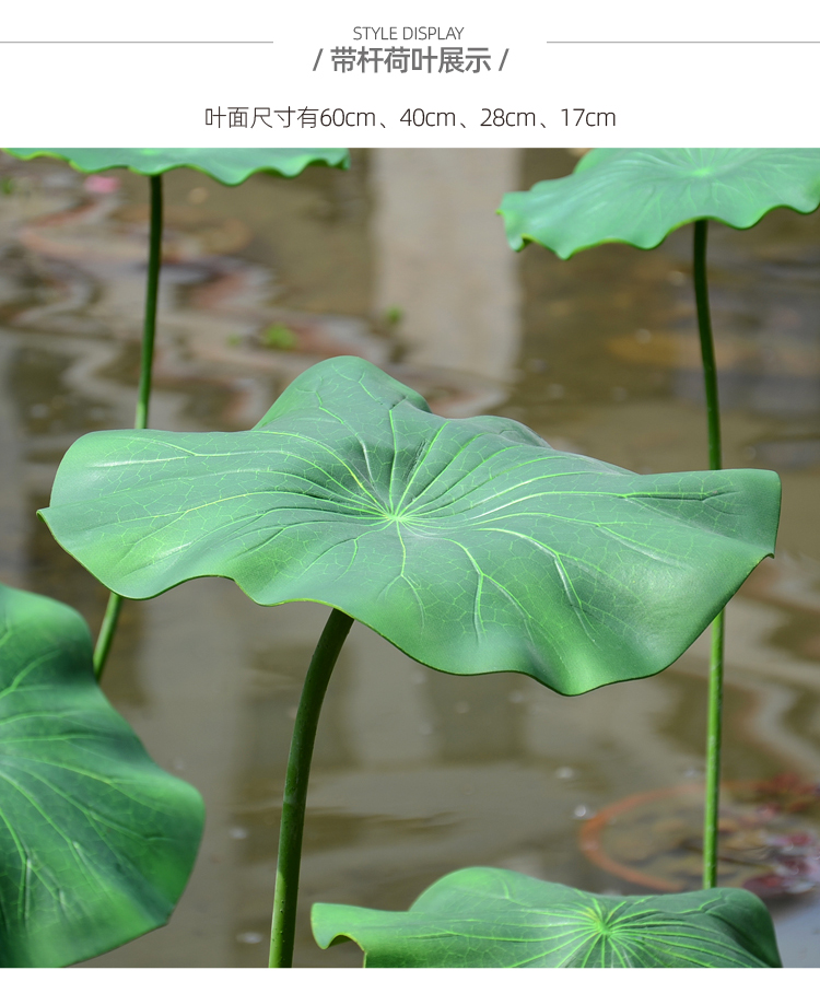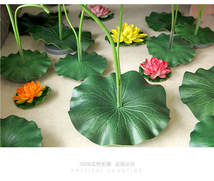 ハスの葉のハスの花の偽のハスの花のシミュレーションの花のプラスチックの大きい緑の植竿の池の装飾の写真を撮ってダンスの道具を演出します。