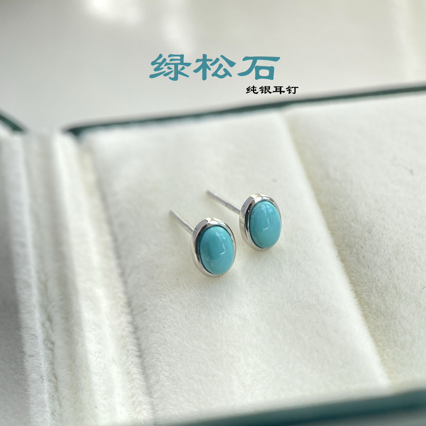 天然湖北原矿绿松石耳钉通体S925纯银蛋面耳饰女款新中式复古耳饰