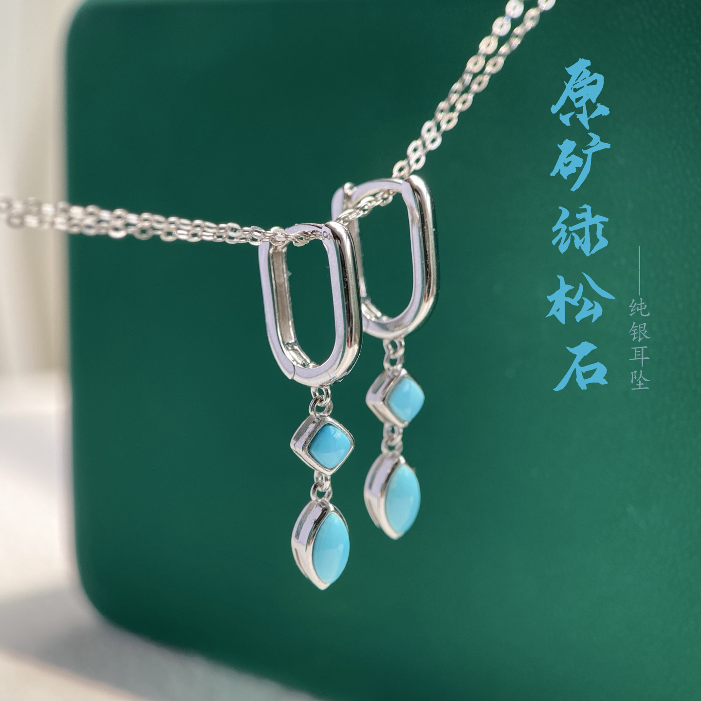天然湖北原矿绿松石耳坠S925银镶嵌无优化马眼工厂直销新中式耳饰