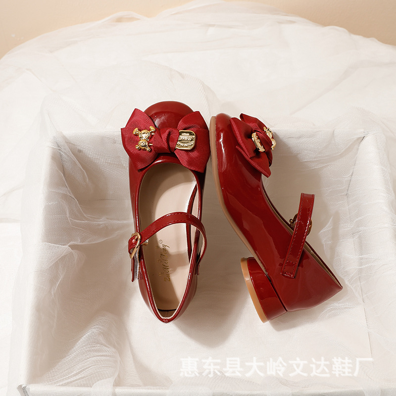女の子用プリンセスシューズ、ソフトソール、子供用ハイヒール、2024春秋新作、おしゃれなリボン付き子供用革靴