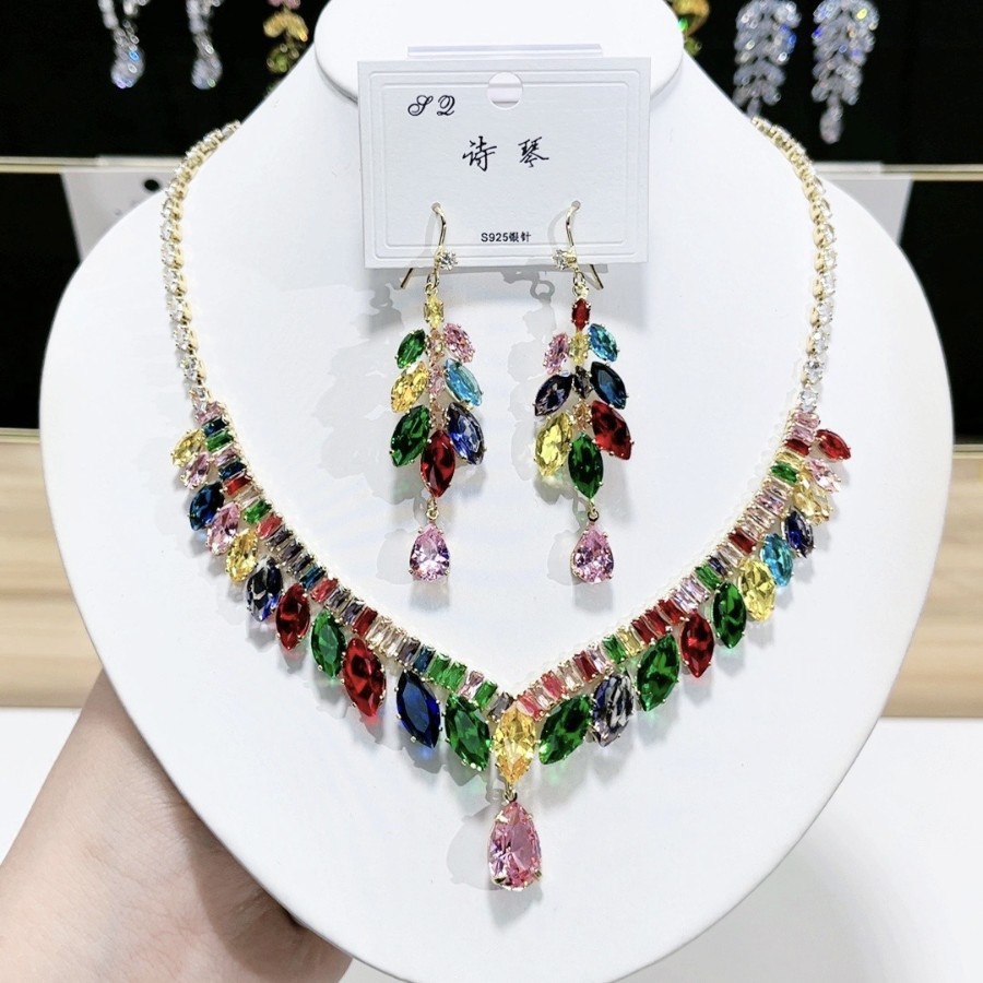 ファッショントレンドジルコン高級ネックレスカラフルなウォータードロップイヤリングセットインライブホットスタイルS925シルバー針着用