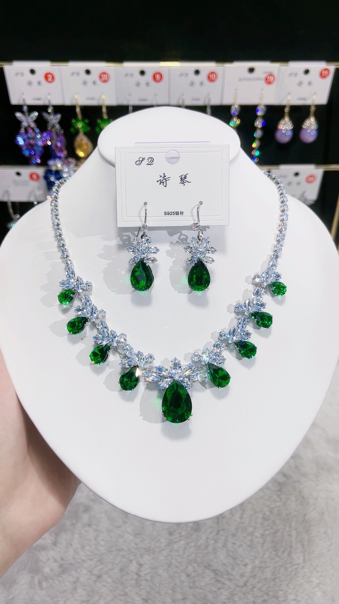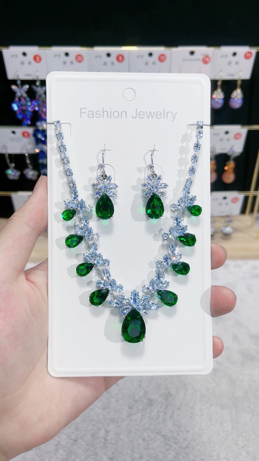 ファッショントレンドジルコン贅沢ネックレスイヤリング緑打鉄花セットins生放送起爆着スカート