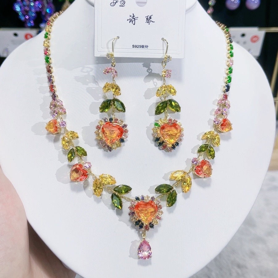 ファッショントレンドジルコン贅沢ネックレスイヤリング小桃心セットins生放送起爆着スカート着用