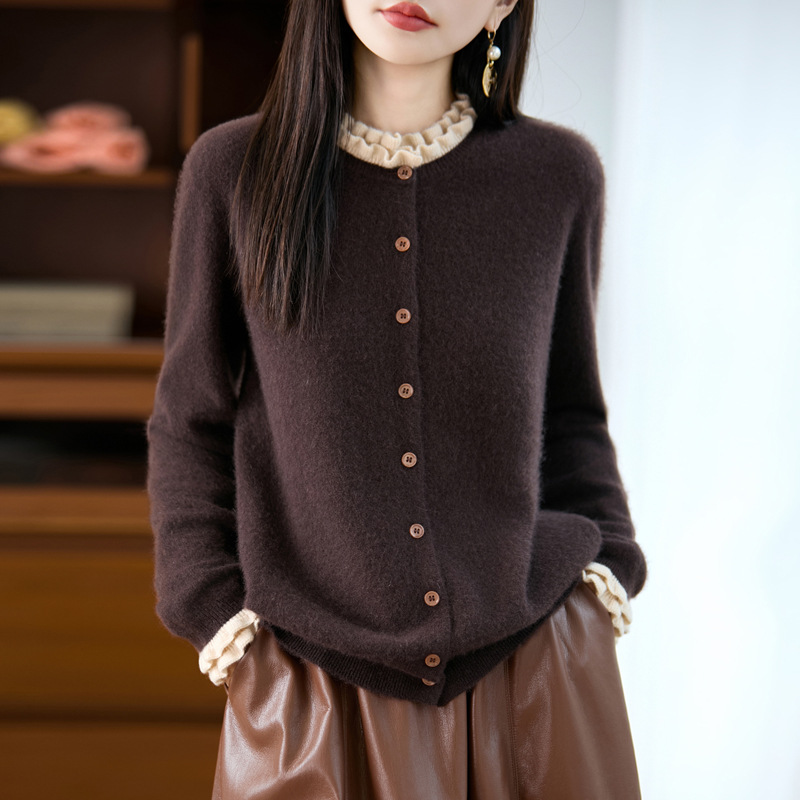 秋冬新款木耳花边设计感100%纯羊毛开衫女软糯亲肤保暖长袖外套潮