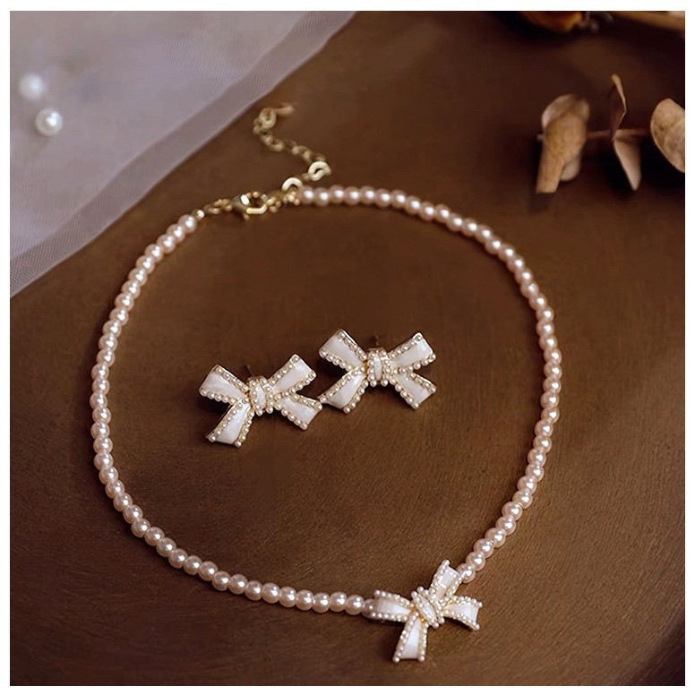 蝴蝶结珍珠项链 儿童项链两件套 儿童饰品现货代发白色精致配饰