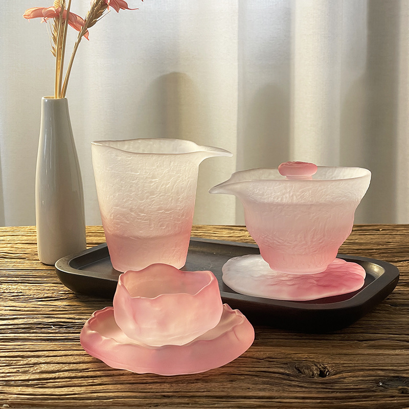 日本式のピンクのガラスの蓋の碗の家庭用三才は茶器の女史の主人の杯の国潮の風品の茗杯の茶器の卸売りを分けます。
