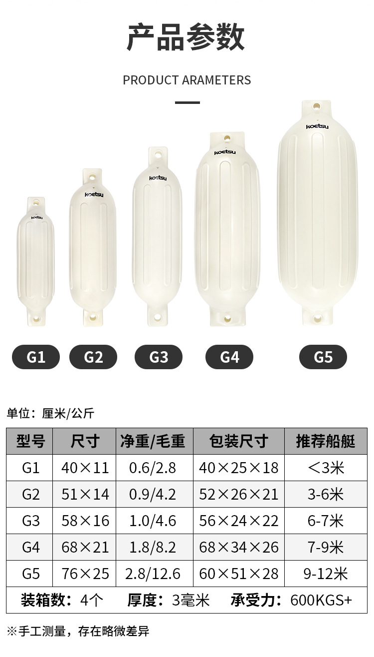 仕様 G1 タイプ 40×11CM ピュアホワイト (< 3m ボートに推奨),G2 タイプ 51×14CM ピュアホワイト (3- 6m ボートに推奨),G3 タイプ 58×16CM ピュアホワイト (6- 7m ボートに推奨),G4タイプ 68×21CM ピュアホワイト (7~ 9m ボートに推奨),G5 タイプ 76×25CM ピュアホワイト (9- 12m ボートに推奨)