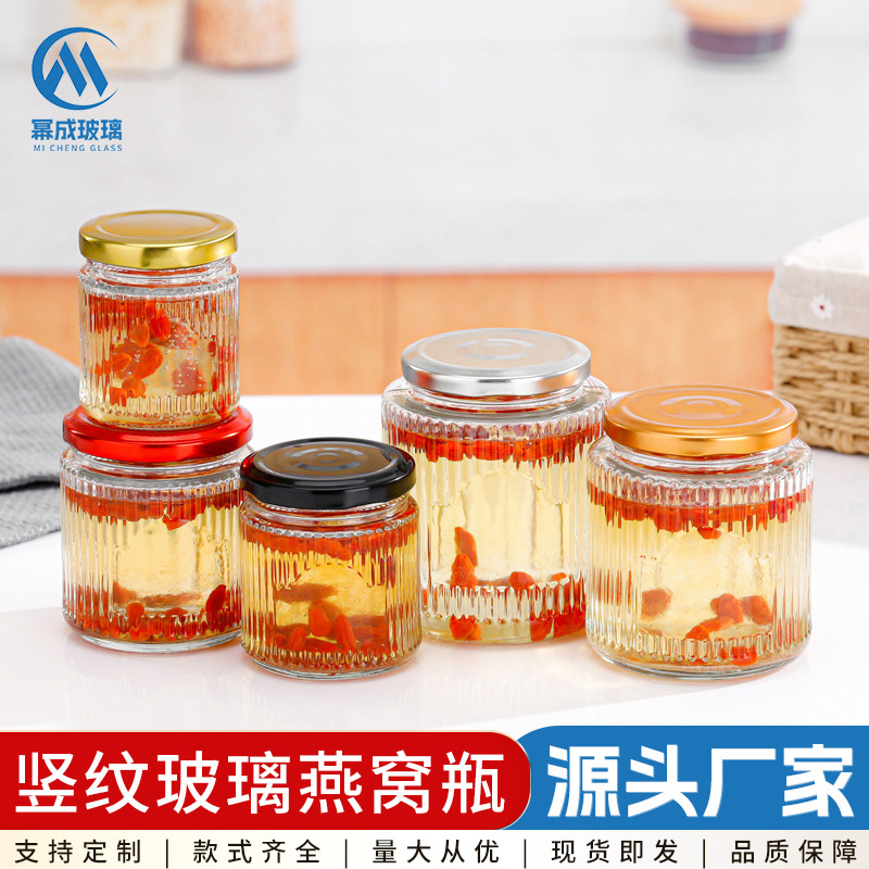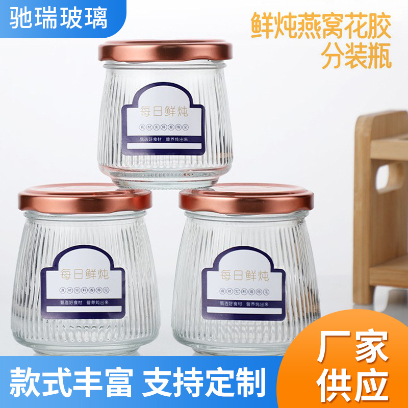 縦模様のガラス製ツバメの巣ボトル、高温耐性、蒸し可能、生の煮込み魚のゼリー、ゼリー、ミルクゼリーボトル、密封ジャム、蜂蜜空ボトル