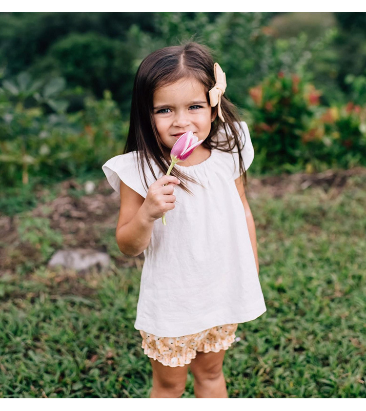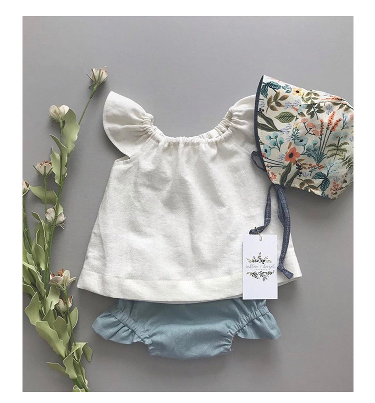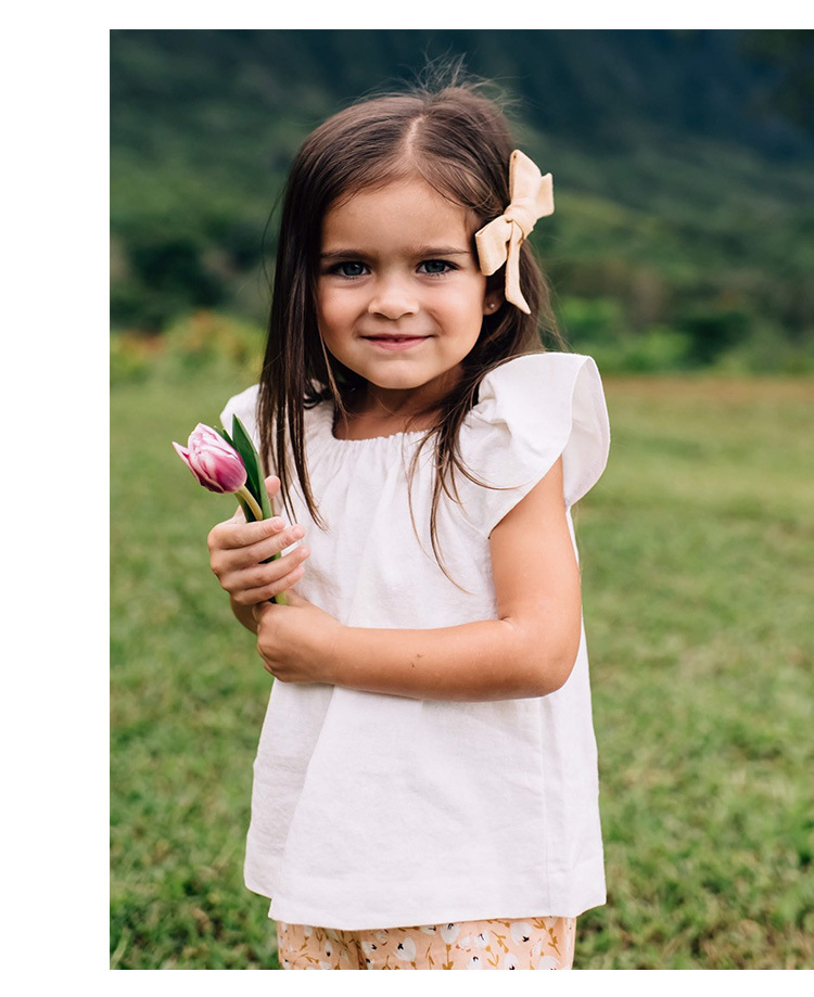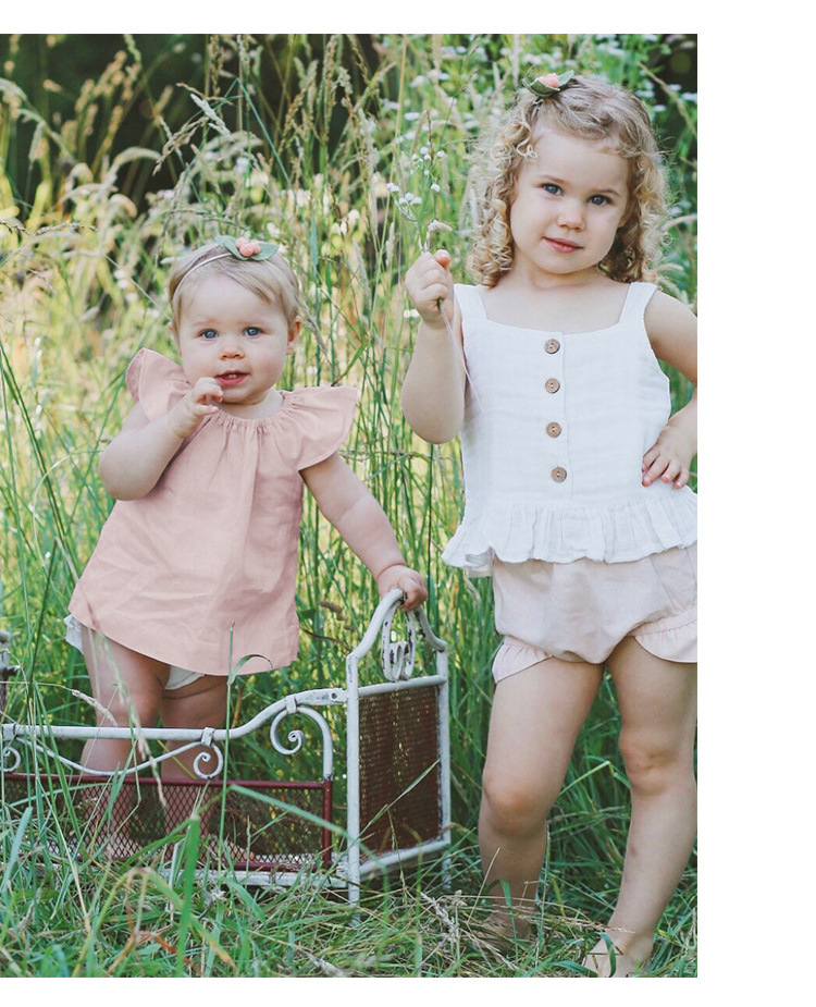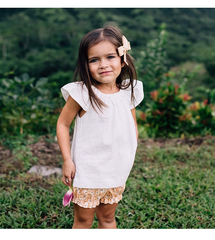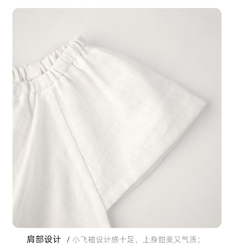 女の子ベスト綿とリネントップス小さなフライングスリーブ子供夏服ニッチデザインラウンドネック女の赤ちゃんかわいい半袖Tシャツ