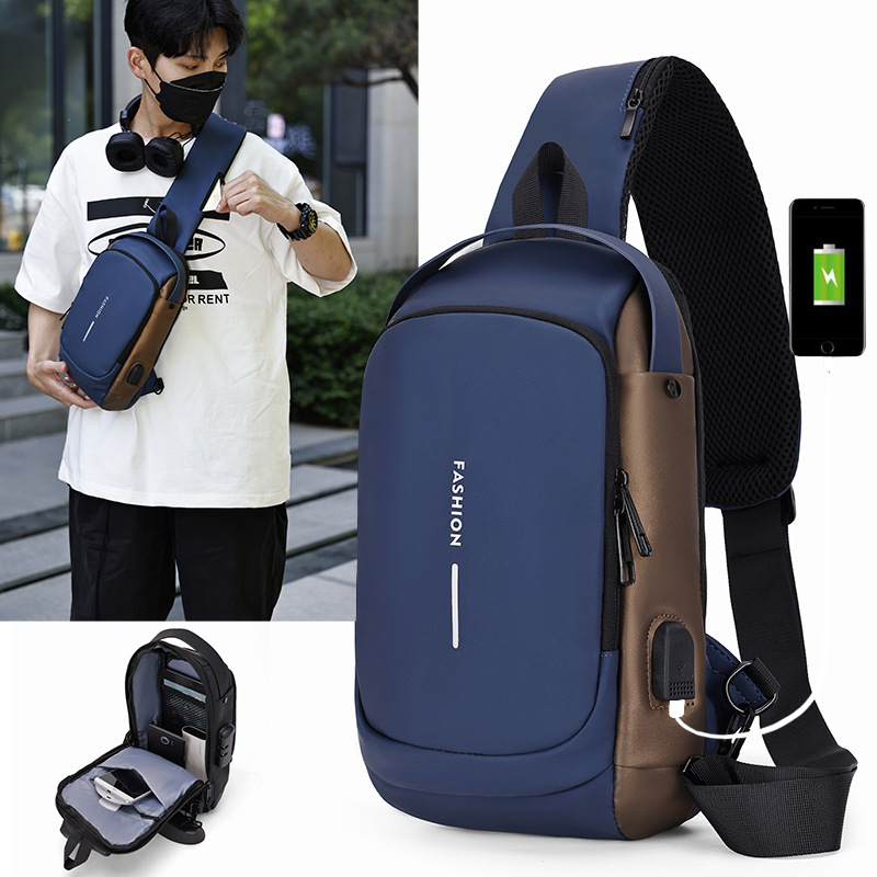 新しい胸カバンの男性のリュックサックUSB充電リュックサックのシングル肩の胸の前のカバンの通勤リュックサックは水をかけないで斜めに胸のカバンにまたがります。