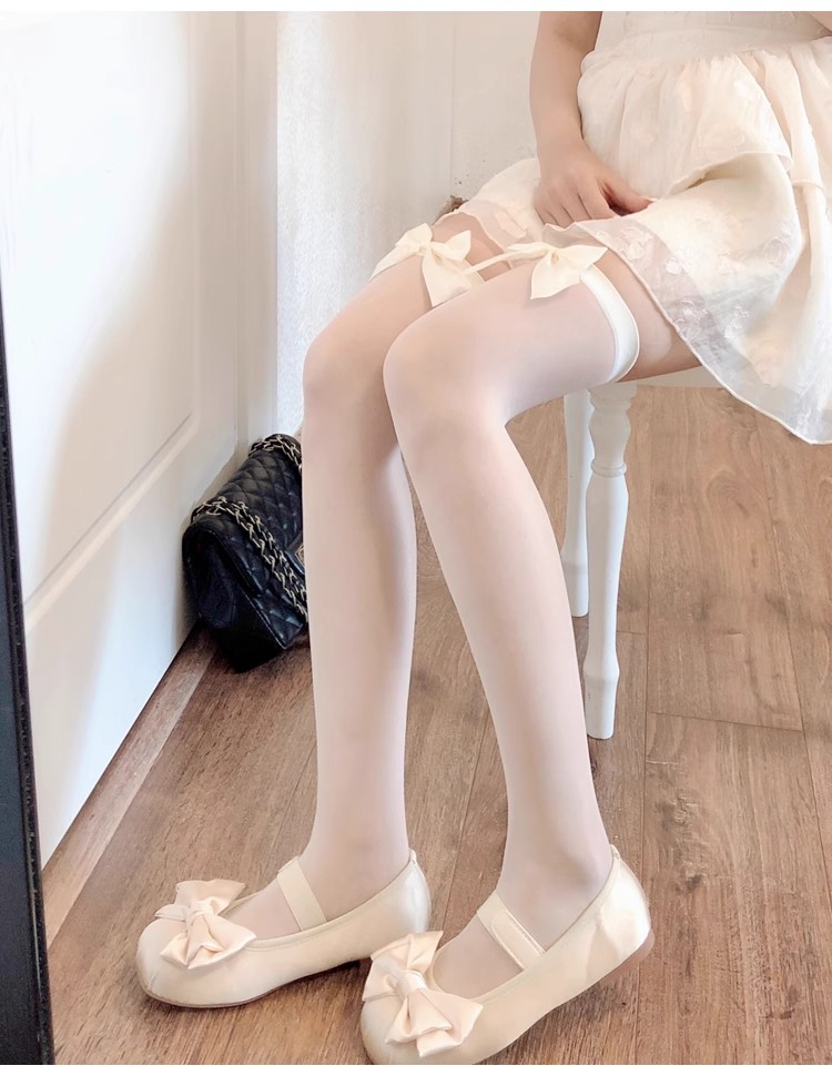 白色蝴蝶结过膝袜女春夏薄款蕾丝洛丽塔长筒袜花边JK芭蕾风大腿袜