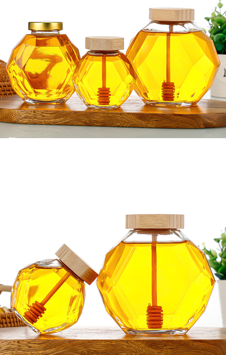国境を越えた卸売フラット六角形蜂蜜ガラス瓶木製蓋と撹拌棒家庭用六角形鉄蓋ジャム詰め替えボトル