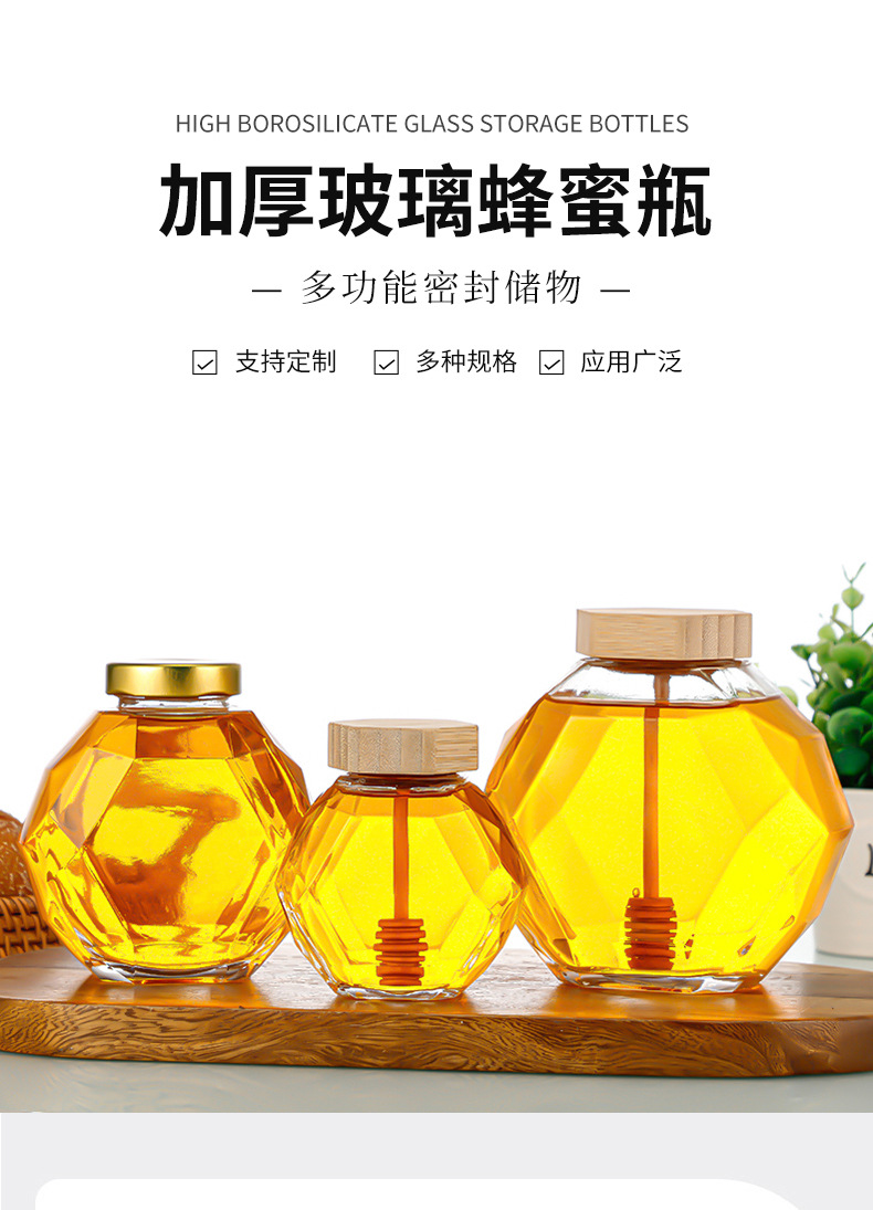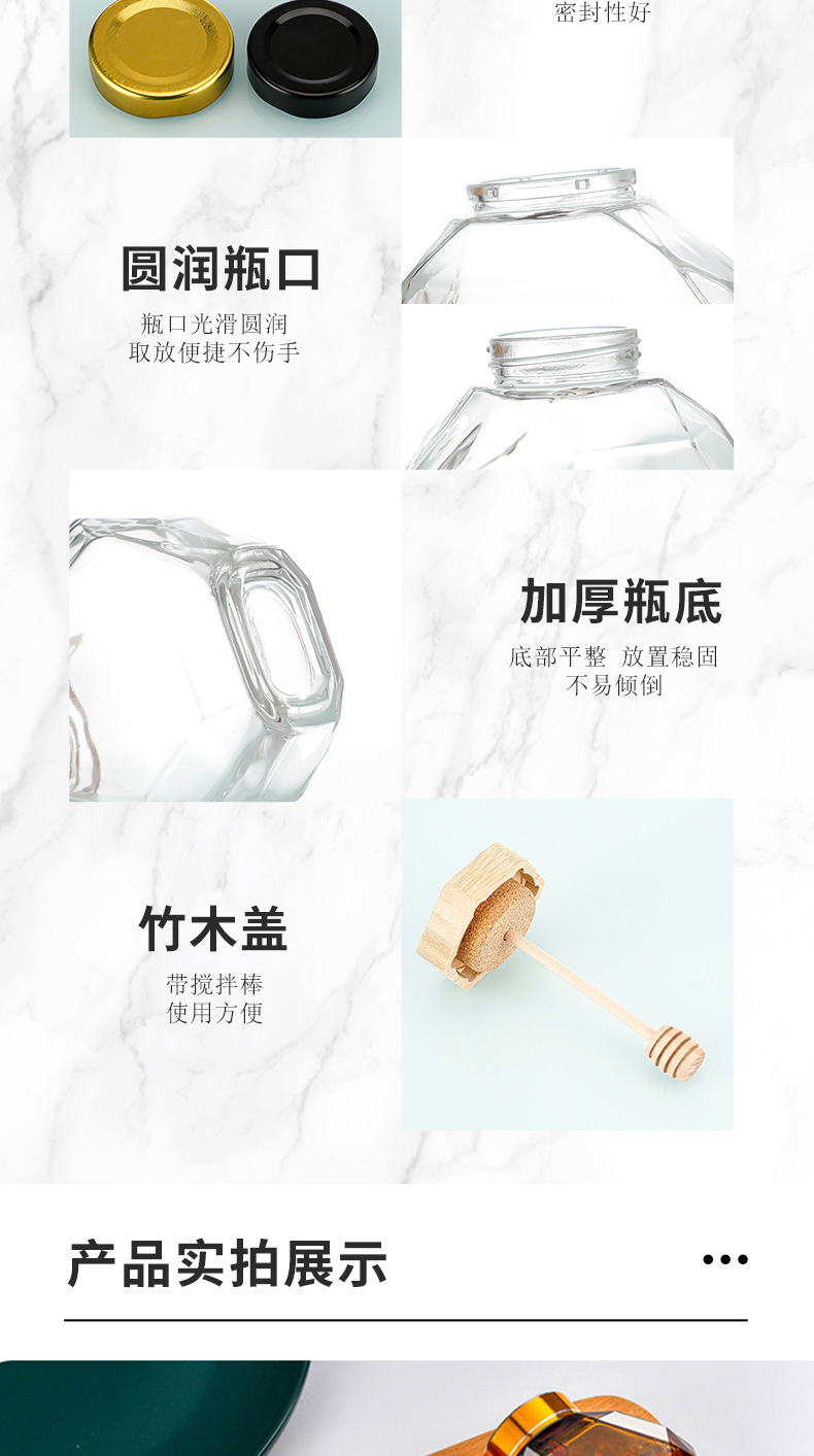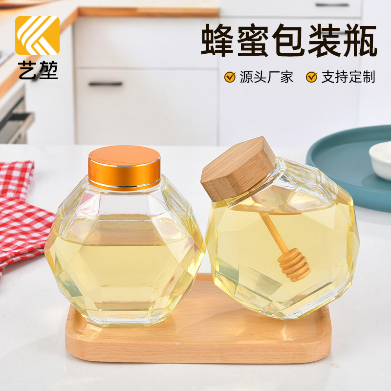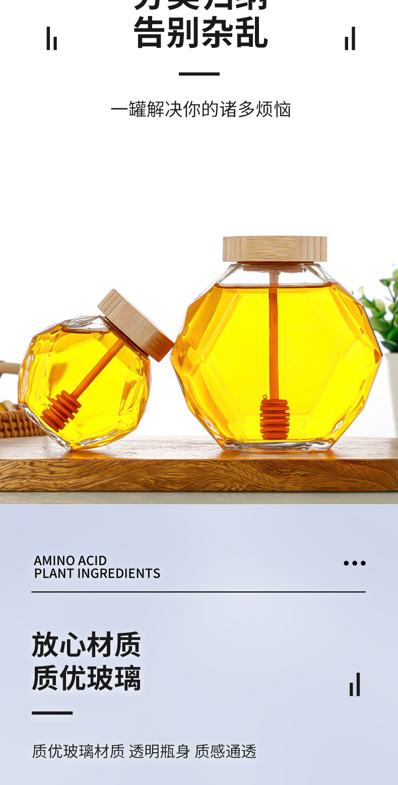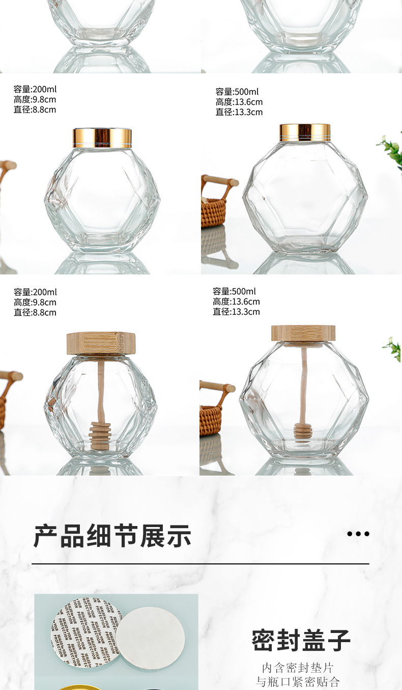 竹木盖玻璃蜂蜜瓶子密封装空瓶六角果酱瓶玻璃罐现货批发带搅拌棒