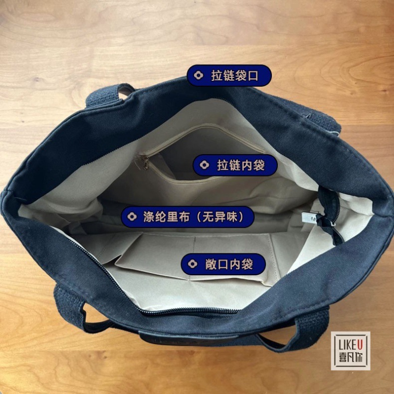 拉链封口。拉链+敞口内袋。涤纶里布(无异味)