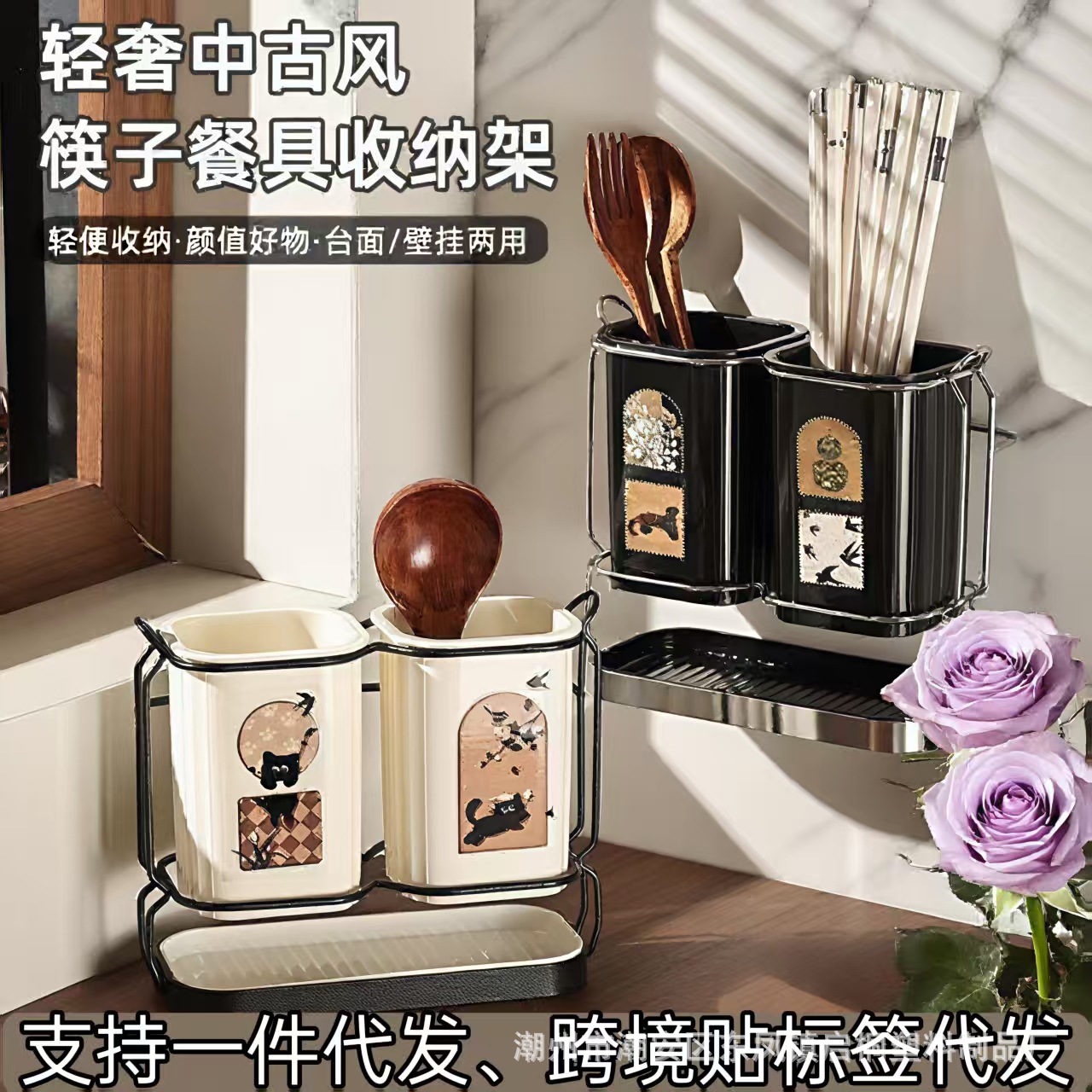 ライトラグジュアリー中世スタイル家庭用壁掛け箸ラックキッチンカウンタートップ排水シンプルな箸ホルダー食器収納ラック