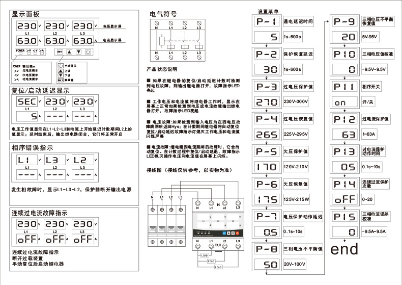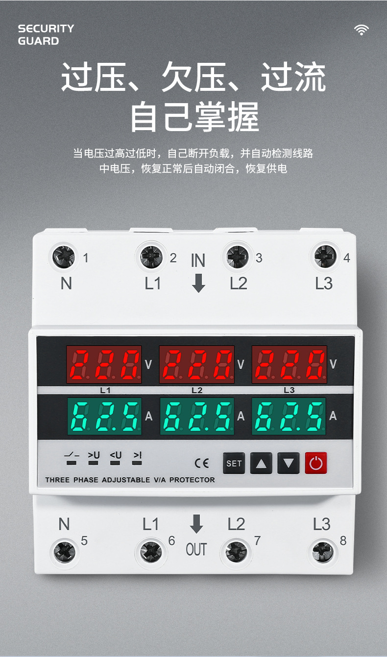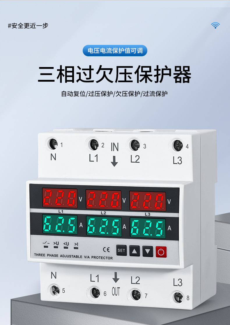 三相 4 線式調整可能なデジタル ディスプレイ自己復帰型過不足電圧および電流制限保護装置過負荷および過電流 63 ゼロ不足および欠相 380V