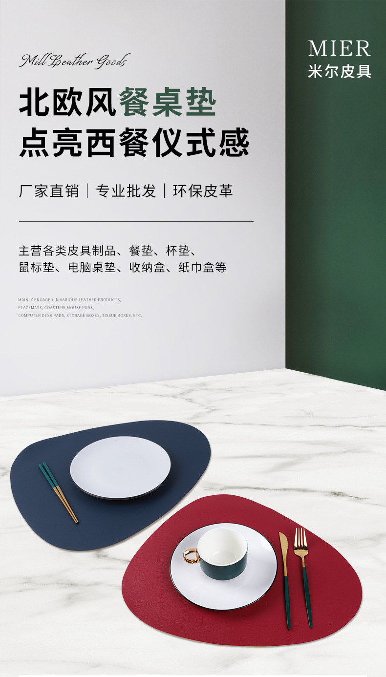 北欧风皮革不规则餐垫椭圆双色双面隔热垫防滑防水防油杯垫女跨境