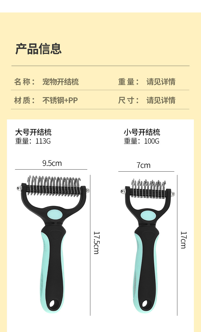 ペットの結び目解消コーム、犬の毛取りコーム、両面結び目解消ナイフ、猫の毛づくろいブラシ、ゴールデンレトリバーの毛取りコーム