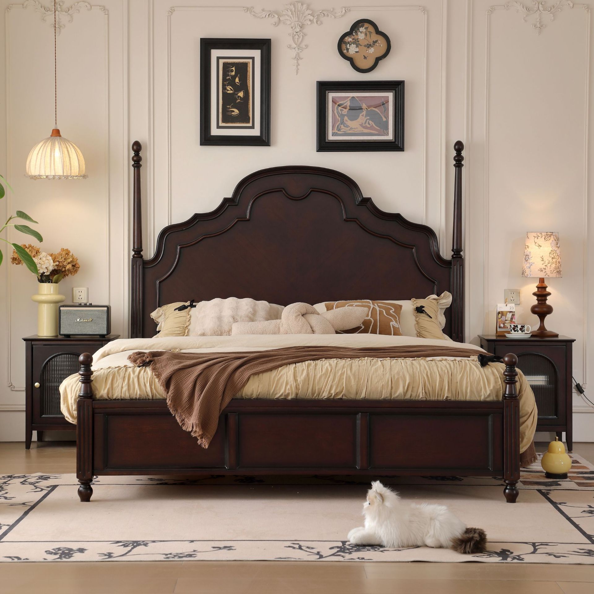 アメリカンレトロなアンナベッド、無垢材ベッド、黒の純無垢材、高級感のあるダブルベッド、フレンチベッド、新作アンティーク調大型ベッド