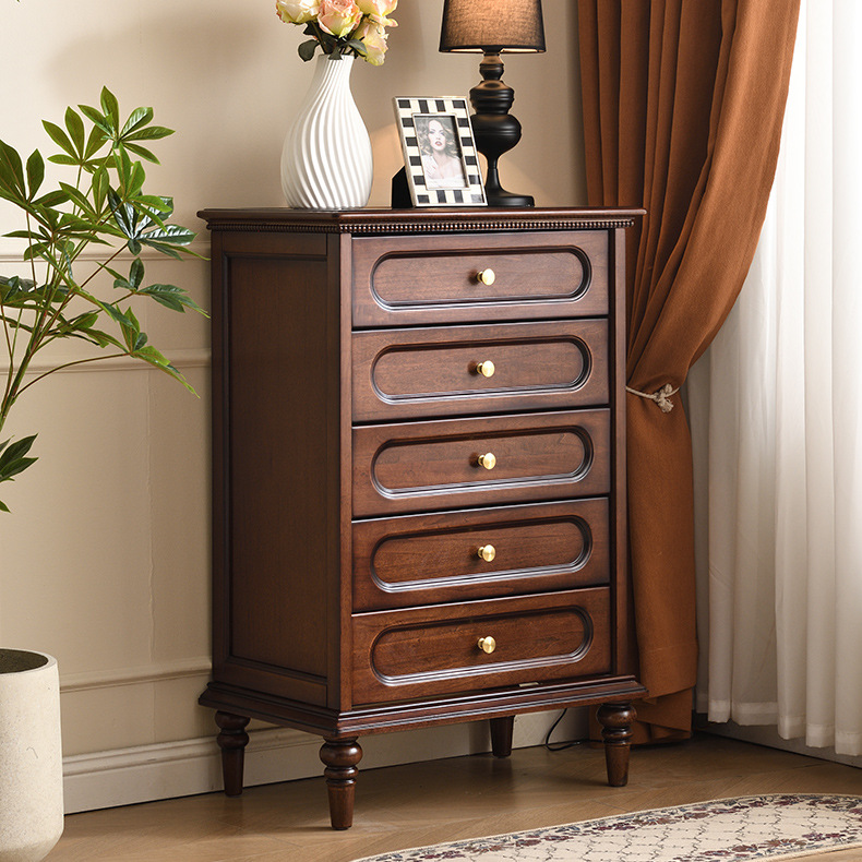 フランス風中世レトロ無垢材五段チェスト、中世風リビングチェスト、玄関チェスト、小部屋寝室ベッドサイド/ベッドエンドチェスト