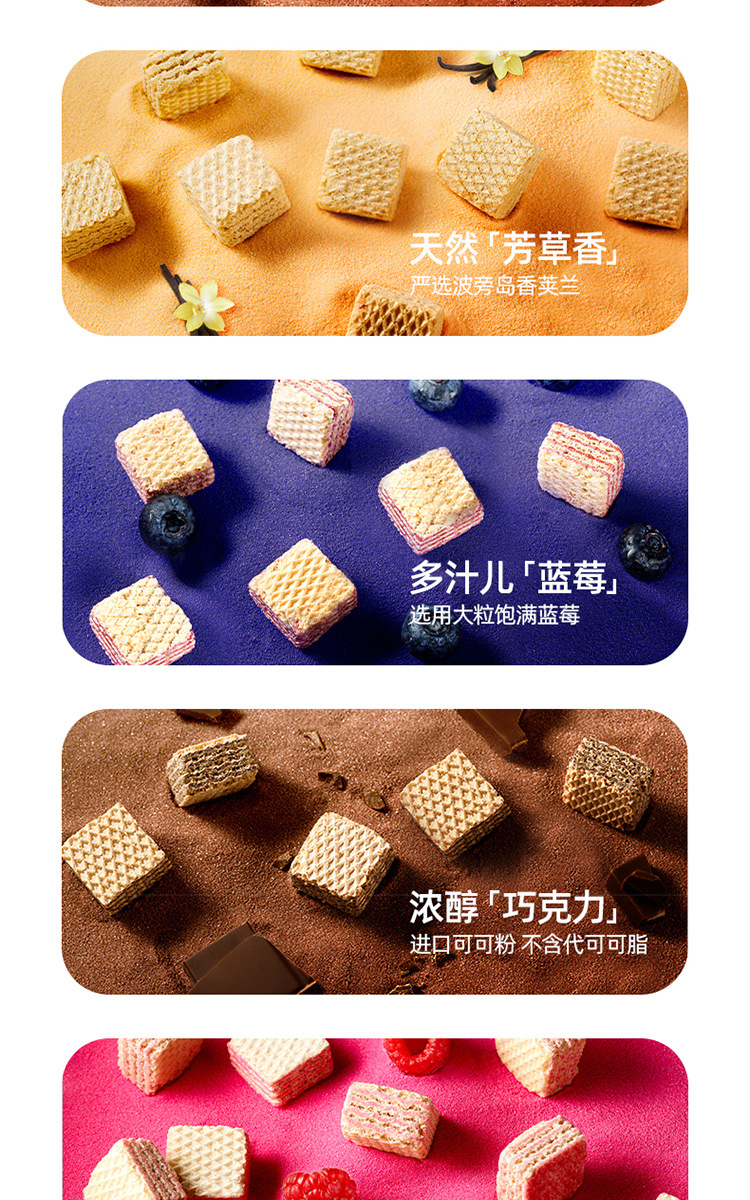 パッケージ仕様 ウエハスクレモン味125g,ウエハースクッキーバニラ味125g,ウエストビスケットのチョコレート味125g,ウエハースクッキーカプチーノ味110g,ウエハースのティラミス味110g,威化榛子味125g,ダークチョコレート味 125g