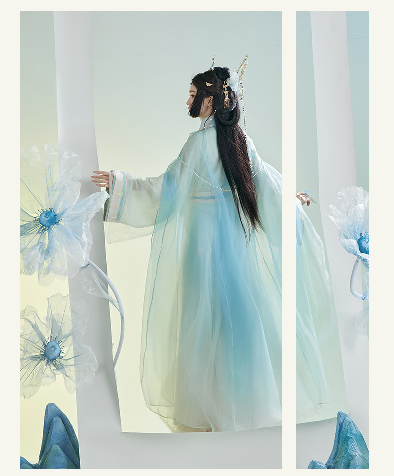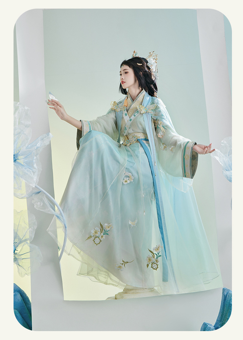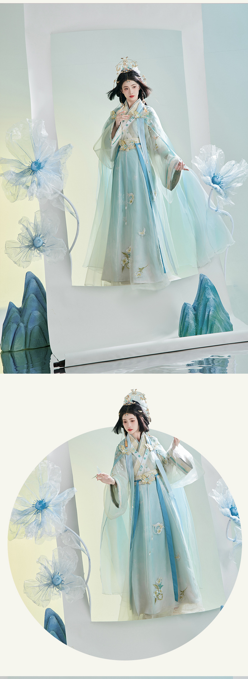 オリジナルの漢服の女性の重工の刺繍の大きい袖の丸い破れたスカートの清冷風の南北朝の江湖の武侠古風の仙気のスーツ