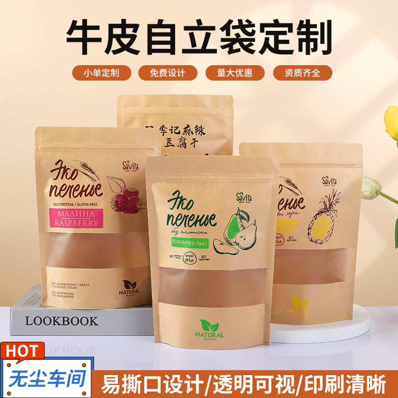 自立型クラフト紙袋自封ドライフルーツ包装密封袋大ナッツ間食開窓密封包装袋制定