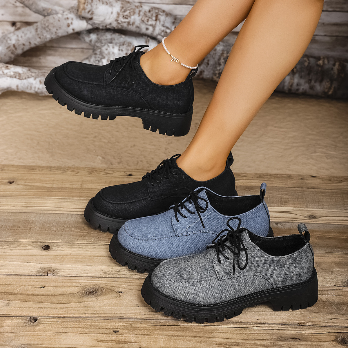 2025秋季新款系带牛仔布厚底乐福鞋大码跨境粗跟复古低帮单鞋女43