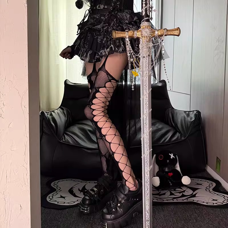 侧边露腿镂空玫瑰花渔网连裤袜暗黑风网红JK薄款提花网袜丝袜