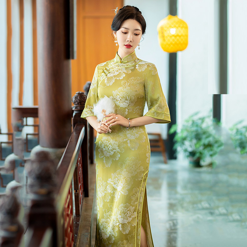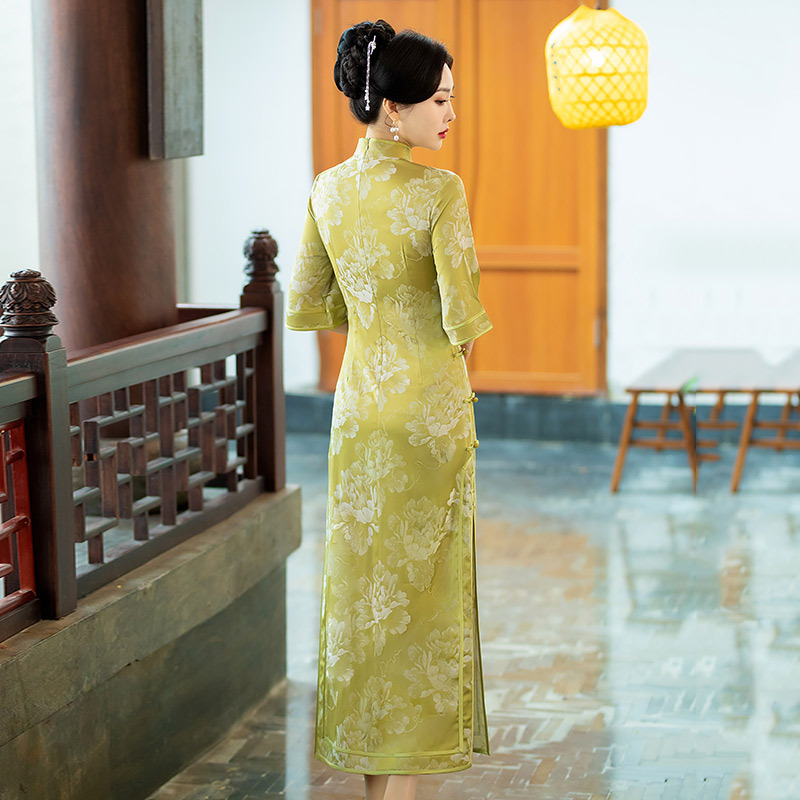 緑の袖なしの国風の中国式の長いタイプはチャイナドレスの2025の新型の若いタイプの女性の復古の修身の古い上海の範を改良します。