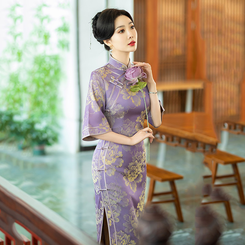 国民スタイルのミドル丈チャイナドレス改良された若いスタイル2025新しいスタイルの女性の新しい中国風レトロスリムミッドレングス長袖春と夏