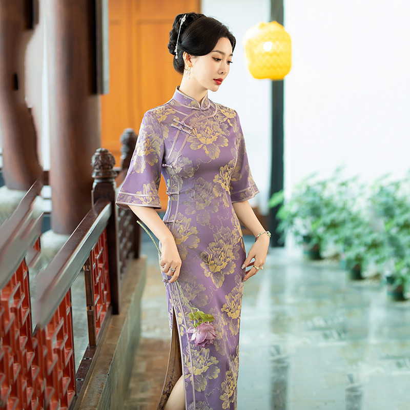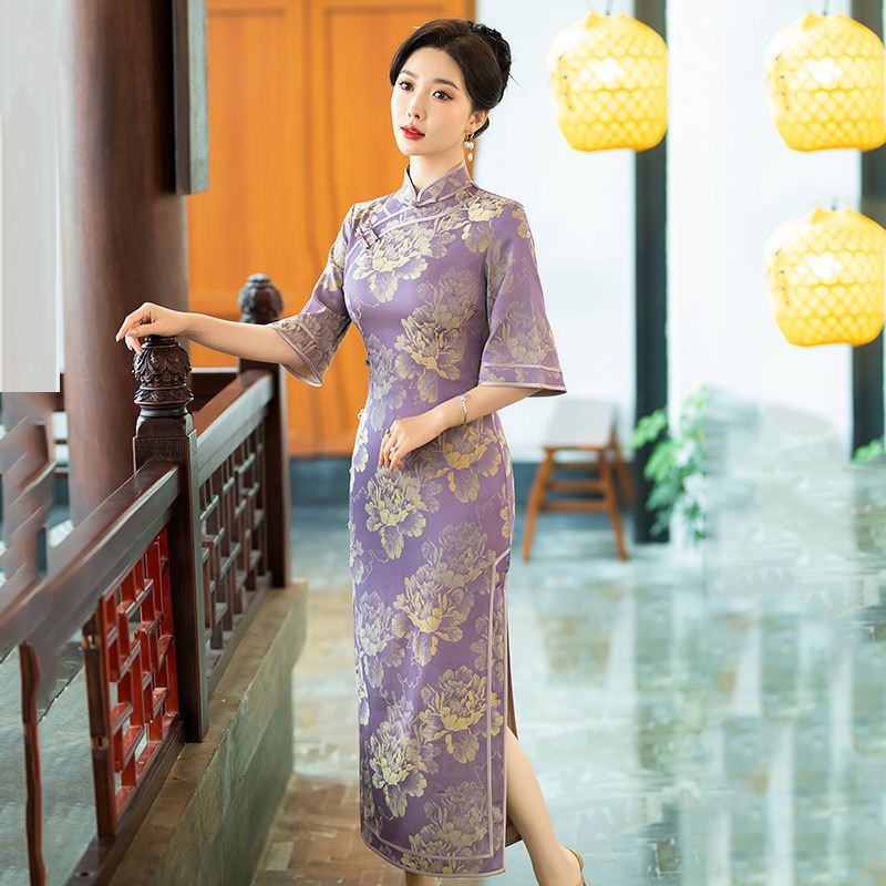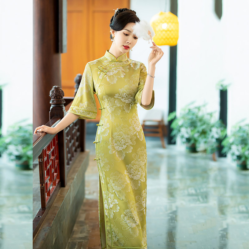 黄金色は中国式の長いタイプの改良チャイナドレス2025の新しい若いタイプの女性のレトロな半袖のショーのドレスをプレゼントします。