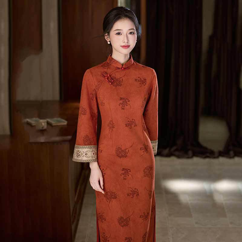 スリムな赤色の中国風ロング丈秋用長袖旗袍改良版ママ服女性用レトロスリムフィットウエストシェイプ秋冬
