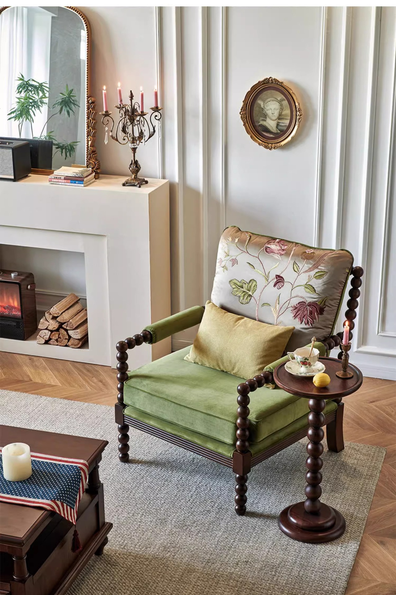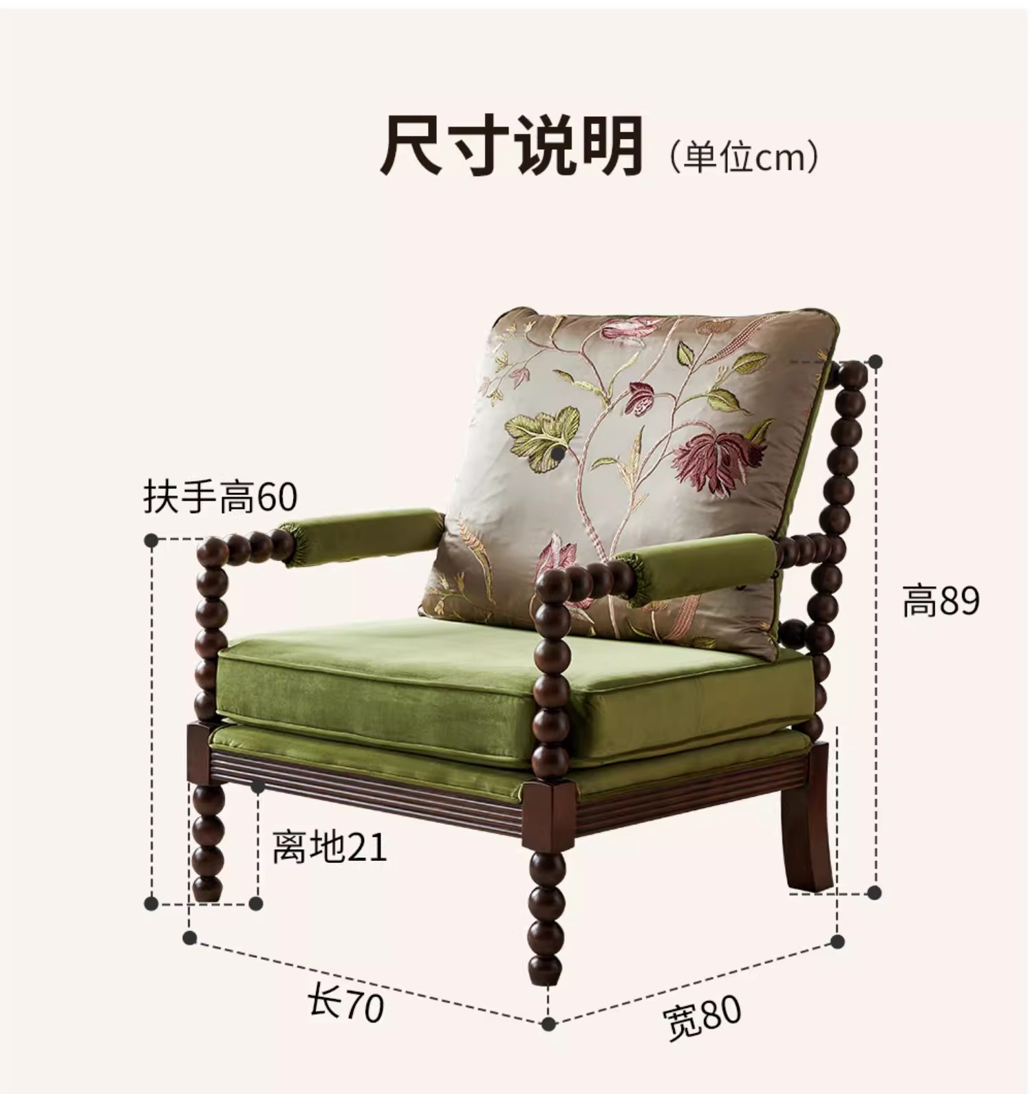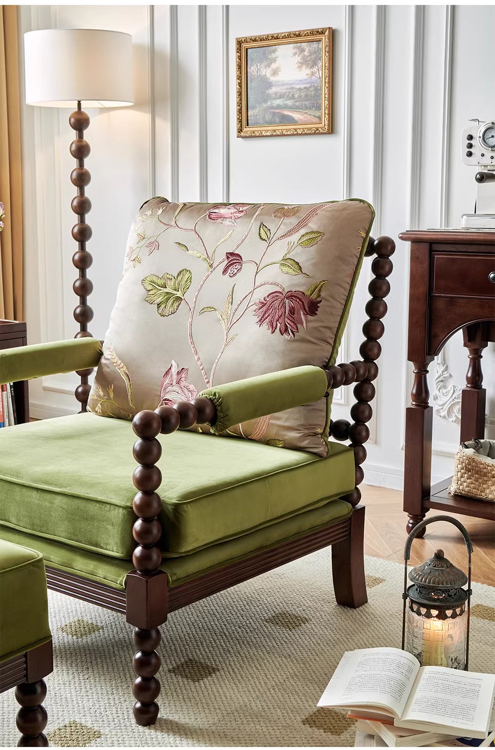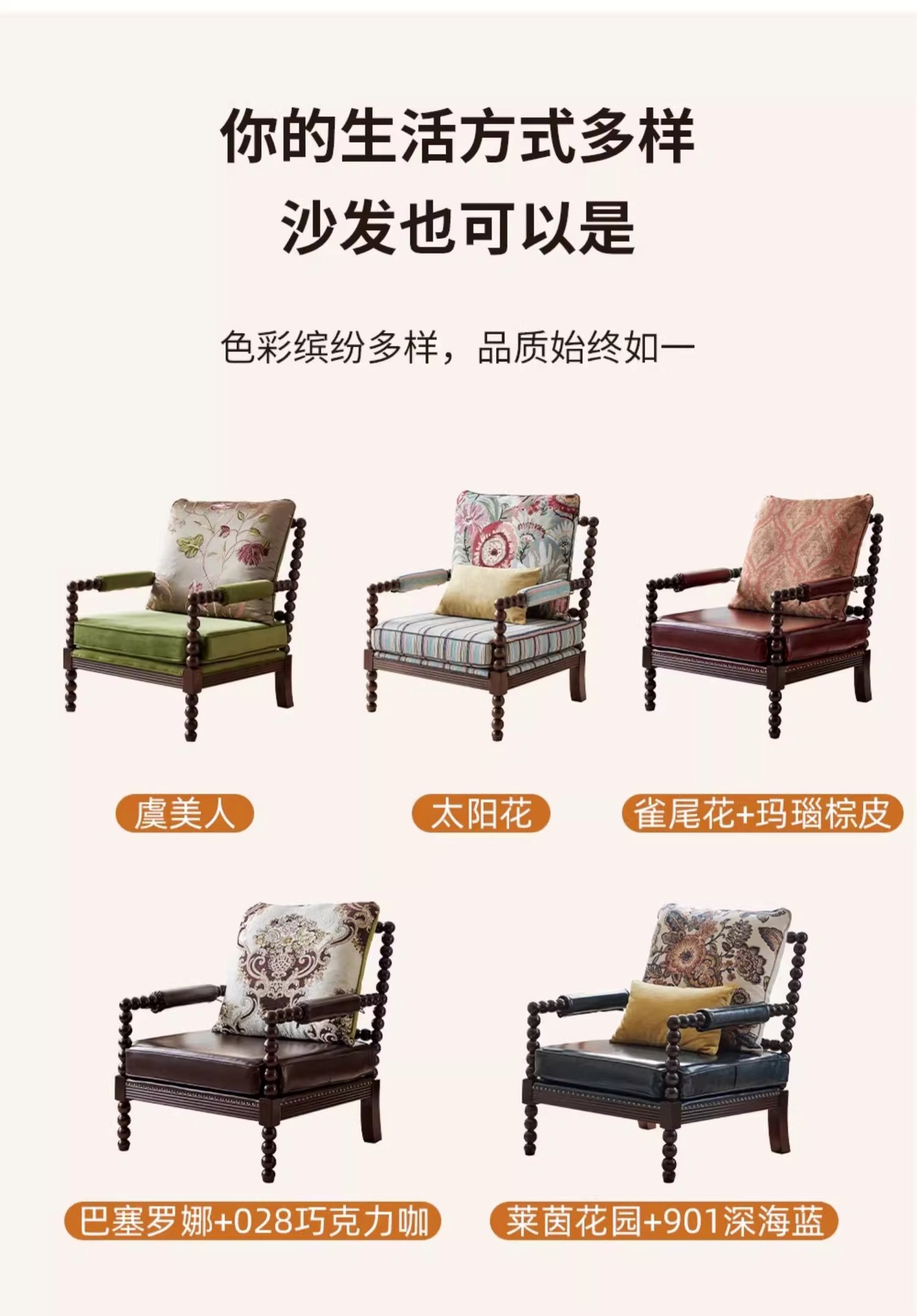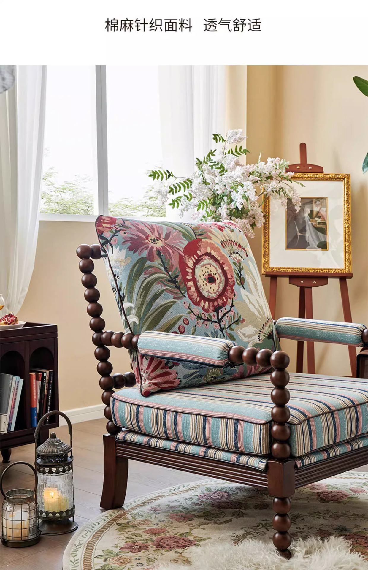 珍珠椅美式复古实木布艺单人沙发法式中古风客厅休闲椅子繁花扶手